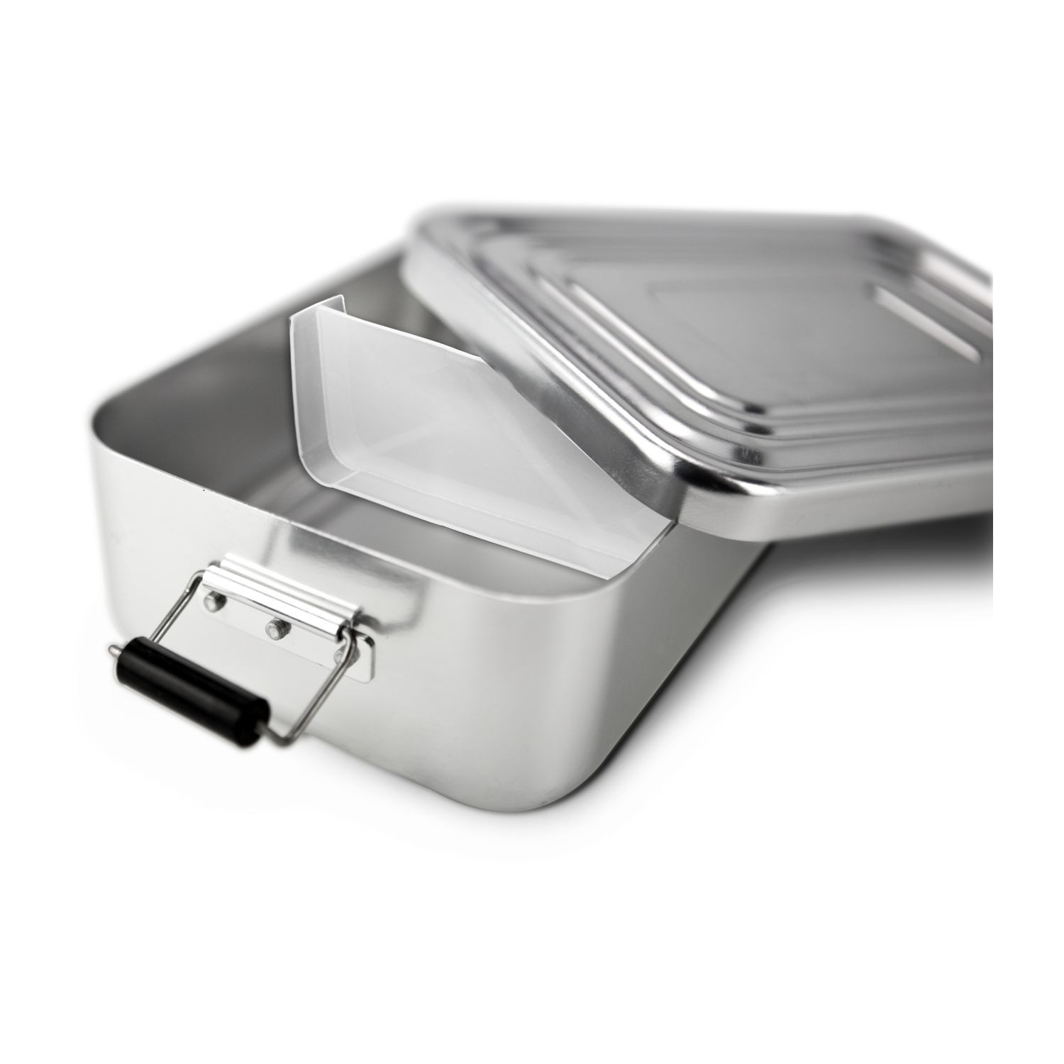 Klassisch, praktisch, leicht und stabil, hygienisch verschließbare silberne Proviantbox mit Dichtungsring, 900 ml Fassungsvermögen, entnehmbarem und verschiebbarem Trennelement, glänzende Oberfläche (Aluminium - poliert, Kunststoff, ohne Inhalt). Die Lunchbox ist in verschiedenen Farben und Größen erhältlich