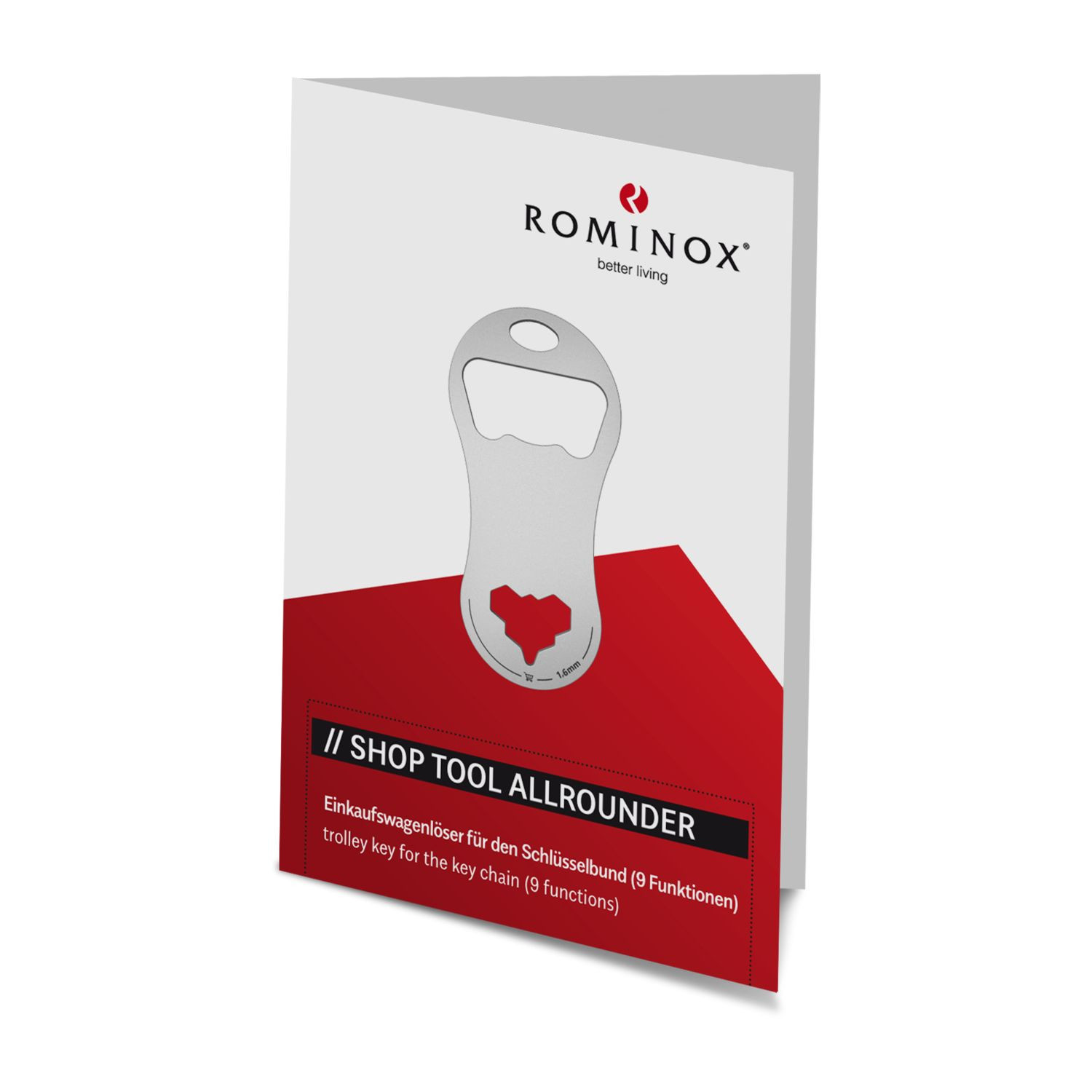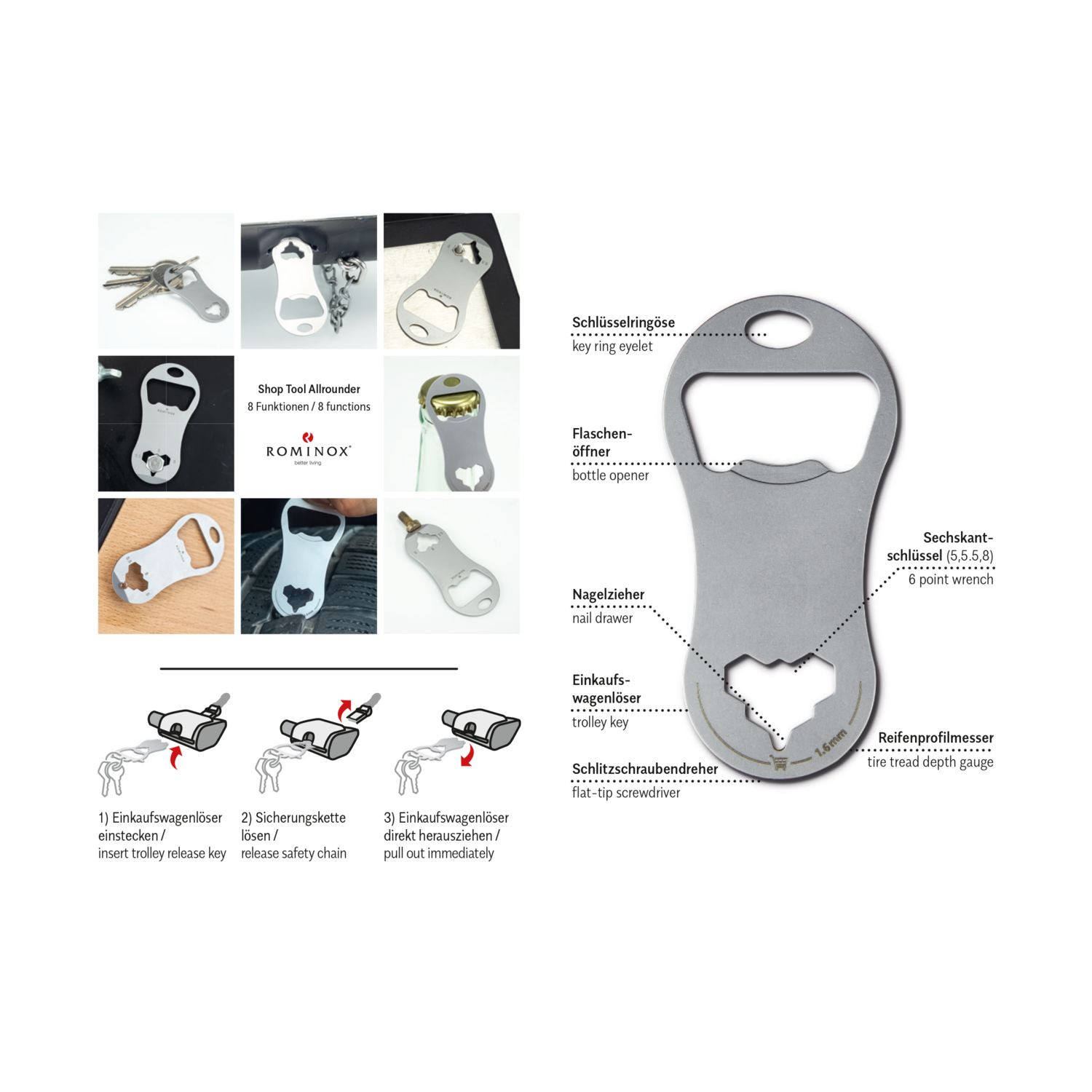 Die praktischen ROMINOX© Multitools gibt es jetzt auch als schlanke Einkaufswagenlöser für den Schlüsselbund! Klein, leicht und doch vielseitig überzeugen die neuen Shop Tools im Alltag. Robuster Werkzeugstahl, inkl. Funktionsbeschreibung und Standard-Kartonverpackung, kundenindividuelle Verpackung ab 100 Stück möglich (Werkzeugstahl). Shop Tool als Schlüsselanhänger mit 8 Funktionen: 1 Einkaufswagenlöser, 1 Flaschenöffner, 1 Schlitzschraubendreher, 1 Reifenprofilmesser (1,6 mm), 1 Nagelzieher, 3 Sechskantschlüssel - ab 3‘000 Stück auch als Sonderproduktion mit individueller Form möglich. Sprechen Sie uns an!