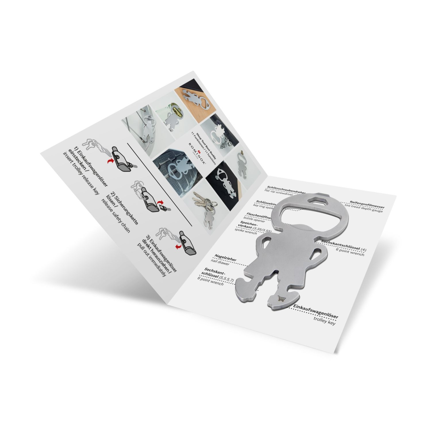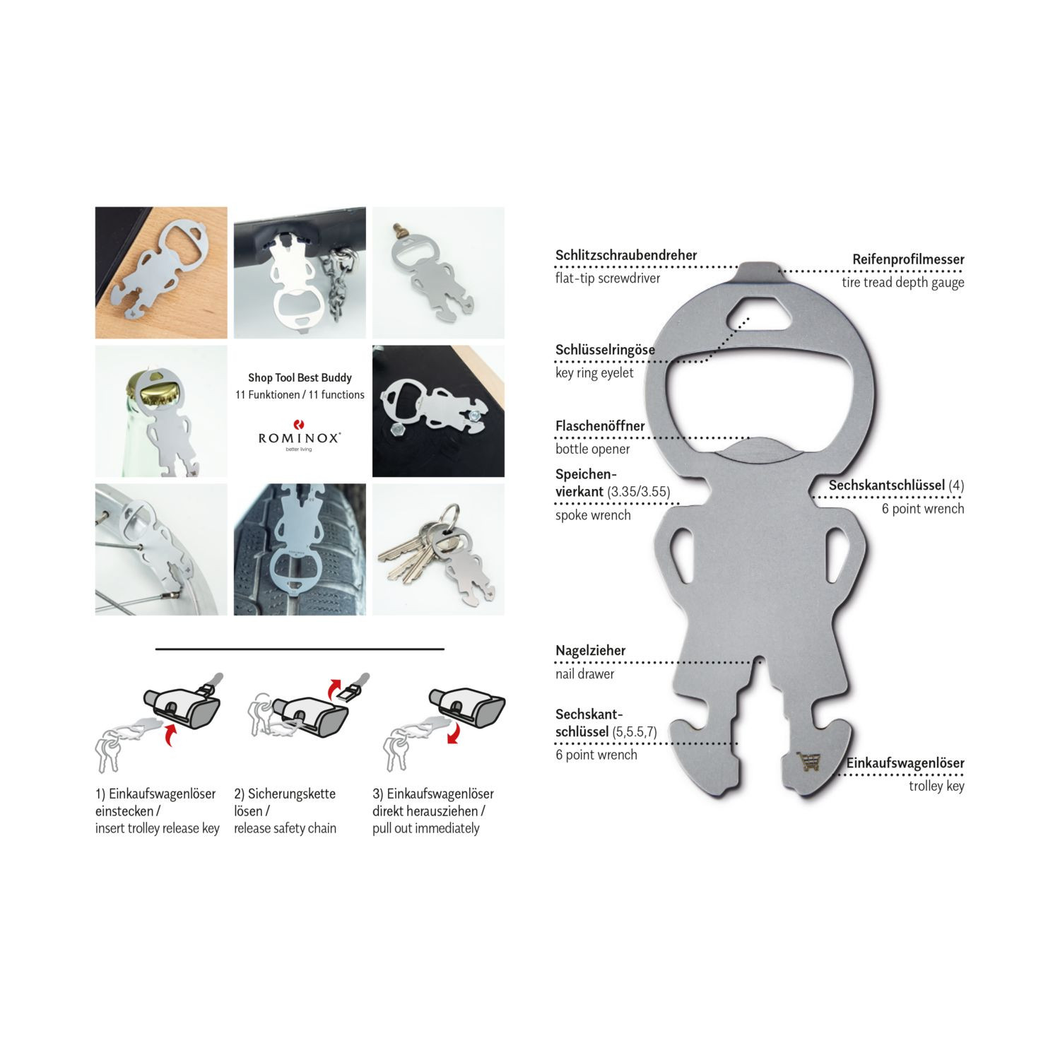 Die praktischen ROMINOX© Multitools gibt es jetzt auch als schlanke Einkaufswagenlöser für den Schlüsselbund! Klein, leicht und doch vielseitig überzeugen die neuen Shop Tools im Alltag. Robuster Werkzeugstahl, inkl. Funktionsbeschreibung und Standard-Kartonverpackung, kundenindividuelle Verpackung ab 100 Stück möglich (Werkzeugstahl). Shop Tool als Schlüsselanhänger mit 11 Funktionen: 1 Einkaufswagenlöser, 1 Flaschenöffner, 1 Schlitzschraubendreher, 1 Reifenprofilmesser (1,6 mm), 1 Nagelzieher, 2 Speichenvierkant, 4 Sechskantschlüssel - ab 3‘000 Stück auch als Sonderproduktion mit individueller Form möglich. Sprechen Sie uns an!