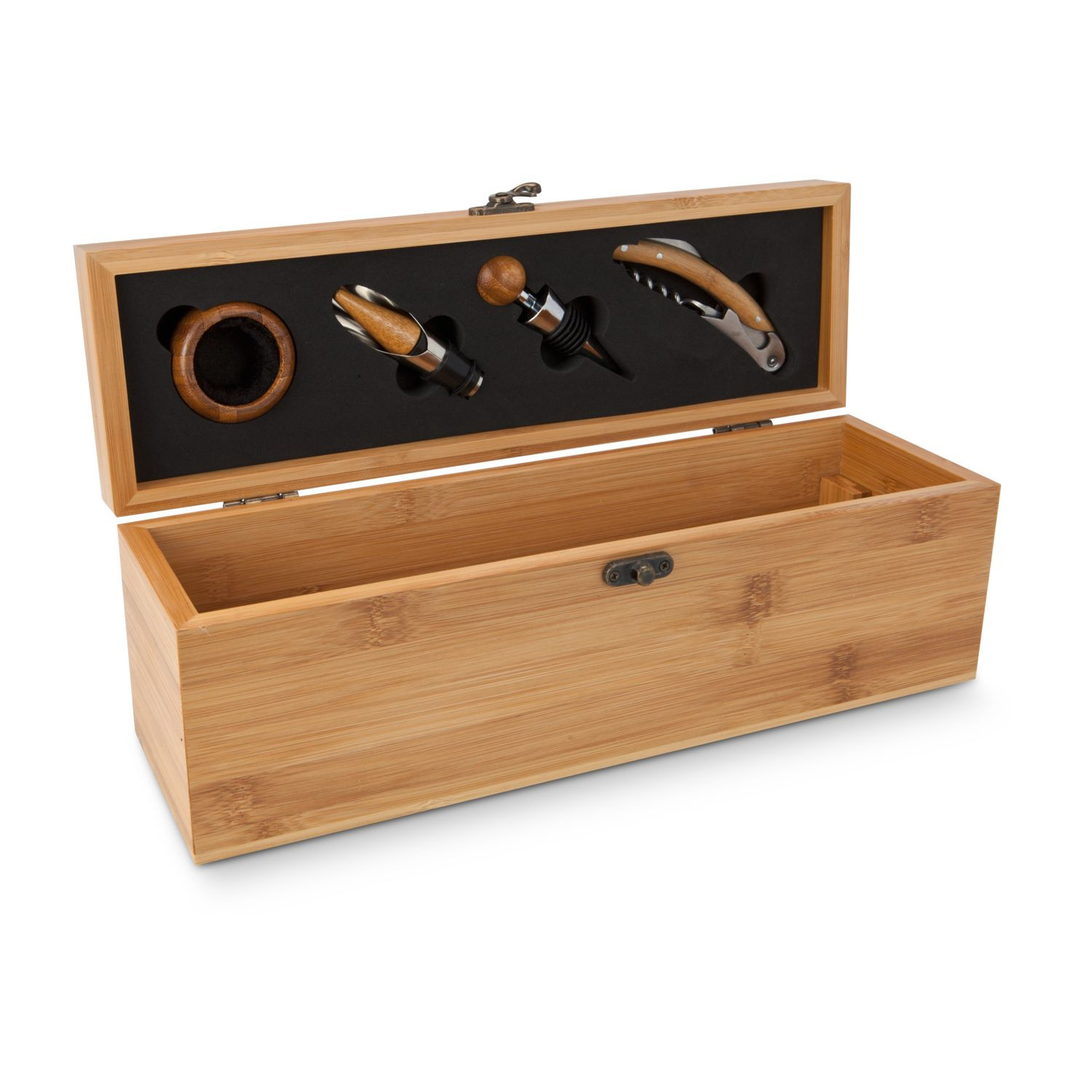 Edle Holzkiste mit Weinaccessoires, nachhaltiger Materialmix aus Edelstahl und Bambus, Sommeliermesser, Flaschenverschluss, Ausgießer, Tropfring (Bambus, Edelstahl, Silikon); Anwendungsbeispiel: Lieferung ohne Wein