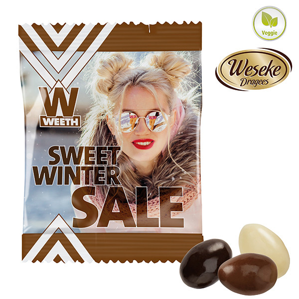 Feine Mandeln dragiert mit Vollmilch-, Zartbitter- und weißer Schokolade in glänzend- oder matt-kaschiertem weißem Werbetütchen verpackt.