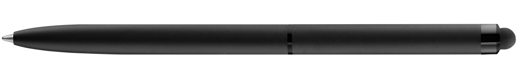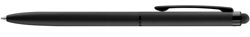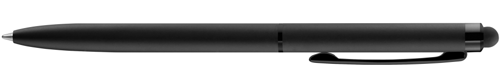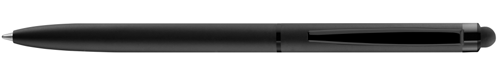 Metall-Drehkugelschreiber mit schwarz mattem Gehäuse und schwarz glänzenden Beschlagteilen. Gummiertes Schaftende für die Touchscreensteuerung.