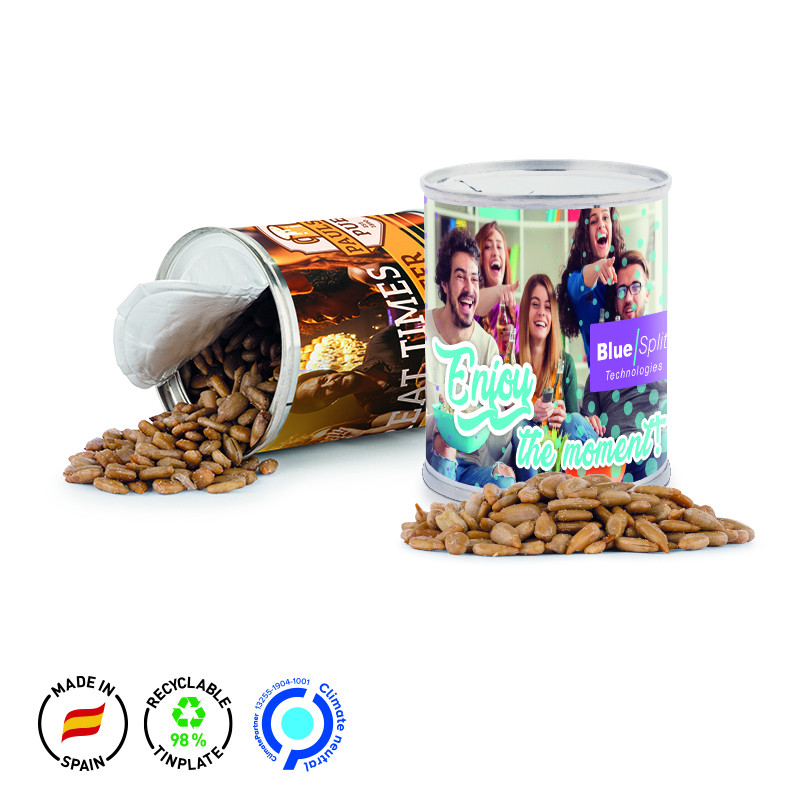 Weißblech 98 % recycelbar. Inhalt: Erdnüsse geröstet und gesalzen, 60 g; Erdnüsse mit Honig und Salz, 50 g; süß gebrannte Mandeln und Erdnüsse, 50 g oder Sonnenblumenkerne gesalzen, 60 g