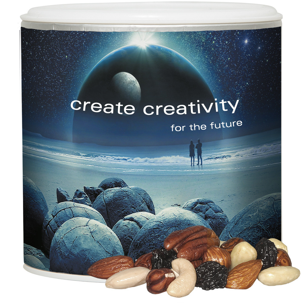 Pappdose Small mit Aufreißmembrane. Werbeanbringung als Etikett in 4c individuell bedruckbar. Zutaten Studentenfutter: Nusskernmischung 60% (in veränderlichen Gewichtsanteilen: Haselnusskerne, Mandeln blanchiert, Mandeln, Cashewkerne, Pekannusskerne), Rosinen 40%; Kann Spuren von anderen Schalenfrüchten und Getreide enthalten. Produkt unterliegt naturgegebenen Schwankungen - trotz strenger Qualitätskontrolle können Schalen- bzw. Kernbestandteile nicht ausgeschlossen werden. Werbeflächengröße: 245 x 68 mm