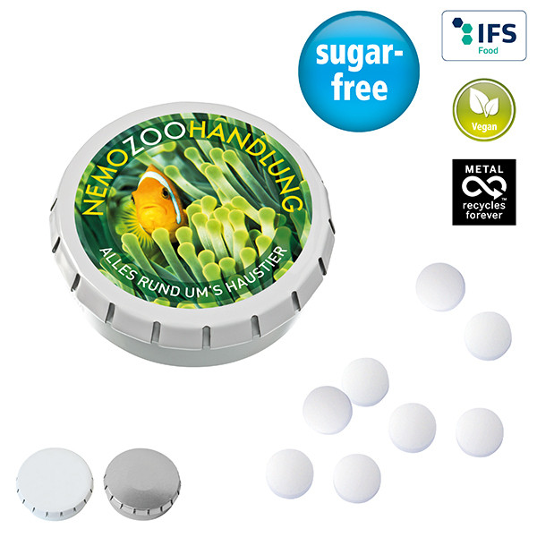 Metalldose weiß oder silberfarben, rund, wiederbefüllbar, einzeln gesleevt mit roter Aufreißhilfe.