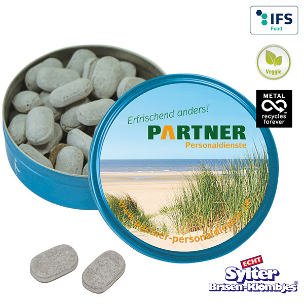 Metalldose rund mit weißem Deckeldruckbereich, wiederbefüllbar, Dosenboden und -rand im „Echt Sylter Brisen Klömbjes“-Design.
