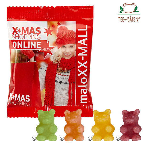 Fruchtgummi Tee-Bären® mit Tee-Extrakt und 10 % Fruchtgehalt aus Fruchtsaftkonzentrat, Aromen und färbenden Pflanzenauszügen, zur Aufbereitung eines Heißgetränks, in glänzend- oder matt-kaschiertem transparentem alternativ weißem Werbetütchen verpackt. Tee-Bären® in eine Tasse mit heißem Wasser geben, umrühren und genießen.