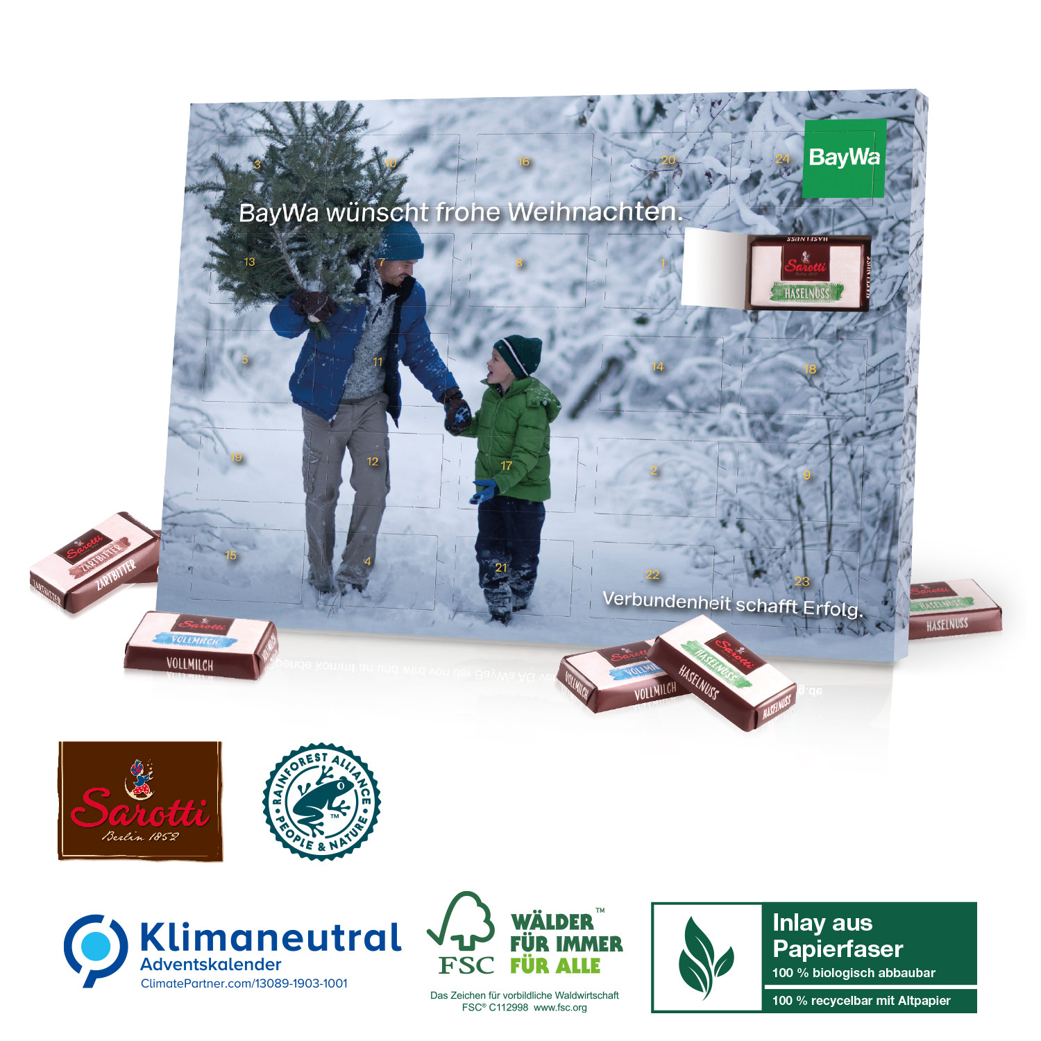 Gut für`s Klima! Individuell bedruckbarer Adventskalender mit feinster Schweizer Markenschokolade in vier Geschmacksrichtungen. Damit versüßen Sie Kunden und Kundinnen die Vorweihnachtszeit. Das Innenteil des Kalenders aus Reinpapier® kann ganz einfach mit Altpapier entsorgt werden. Darüber hinaus ist es biologisch abbaubar. Klimaneutral produziert durch finanziellen Klimabeitrag. Produktdetails: Schokoladen-Adventskalender in hochwertiger Vollkartonhülle im Querformat, mit praktischem Tischaufsteller zum Ausklappen. Gleich mitbestellen: Einzelversandkarton für den Postversand. Nachhaltigkeit: Klimaneutrales Produkt mit finanziellem Klimabeitrag, auf FSC®-zertifiziertem Karton aus nachhaltiger Forstwirtschaft und anderen kontrollierten Quellen. Durch den Kauf von Rainforest Alliance-zertifiziertem Kakao unterstützen Sie den nachhaltigen Kakao-Anbau (www.rainforest-alliance.org). Inlay 100 % biobasiert, aus nachwachsenden Rohstoffen hergestellt, biologisch abbaubar und kompostierbar nach DIN EN 13432. 100 % recycelbar, Entsorgung zusammen mit Altpapier Haltbarkeit bis 31.03.2025