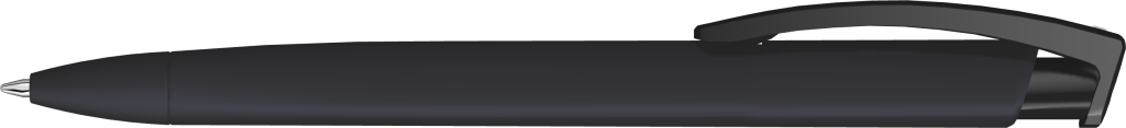 Druckkugelschreiber mit gummiertem Dreikantgehäuse und gedeckt glänzendem Clip.