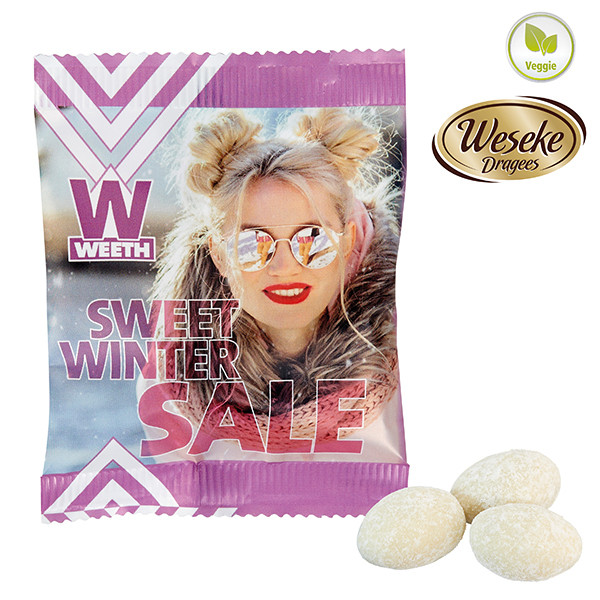 Feine Mandeln dragiert mit 74 % weißer Schokolade mit Vanillegeschmack, umhüllt mit Puderzucker, in glänzend- oder matt-kaschiertem weißem Werbetütchen verpackt.