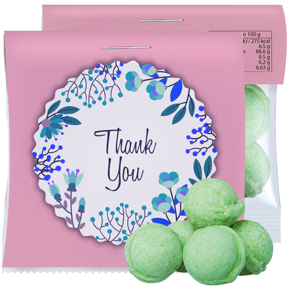 Mini-Tüte aus transparenter Folie. Werbeanbringung als Werbereiter in 4c individuell bedruckbar. Zutaten Waldmeister-Brause Bonbons: Zucker, Glukosesirup, Säuerungsmittel: Citronensäure, Natriumhydrogencarbonat, Aroma, Farbstoff: Kupferhaltige Komplexe der Chlorophylline Werbeflächengröße: 75 x 104 mm