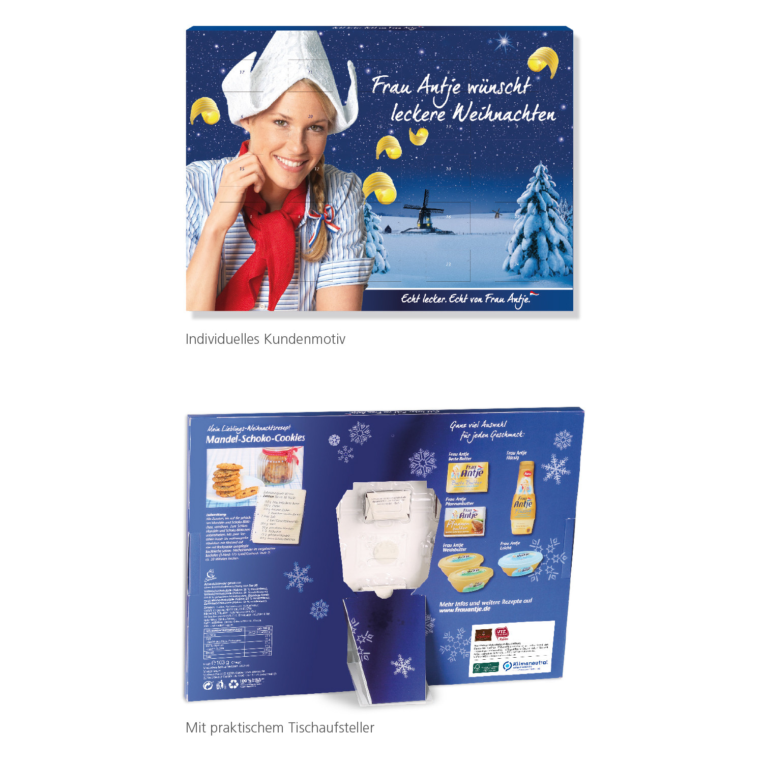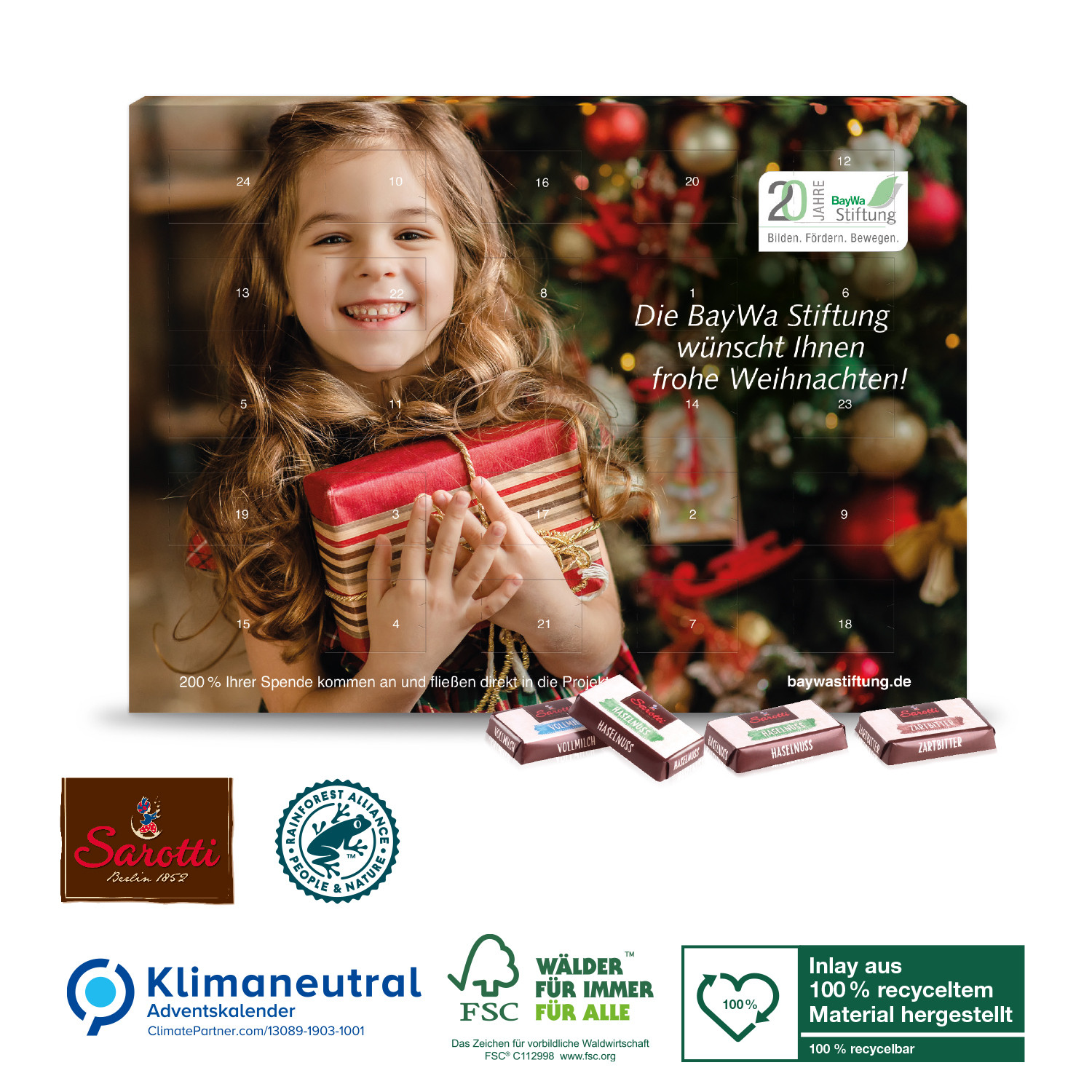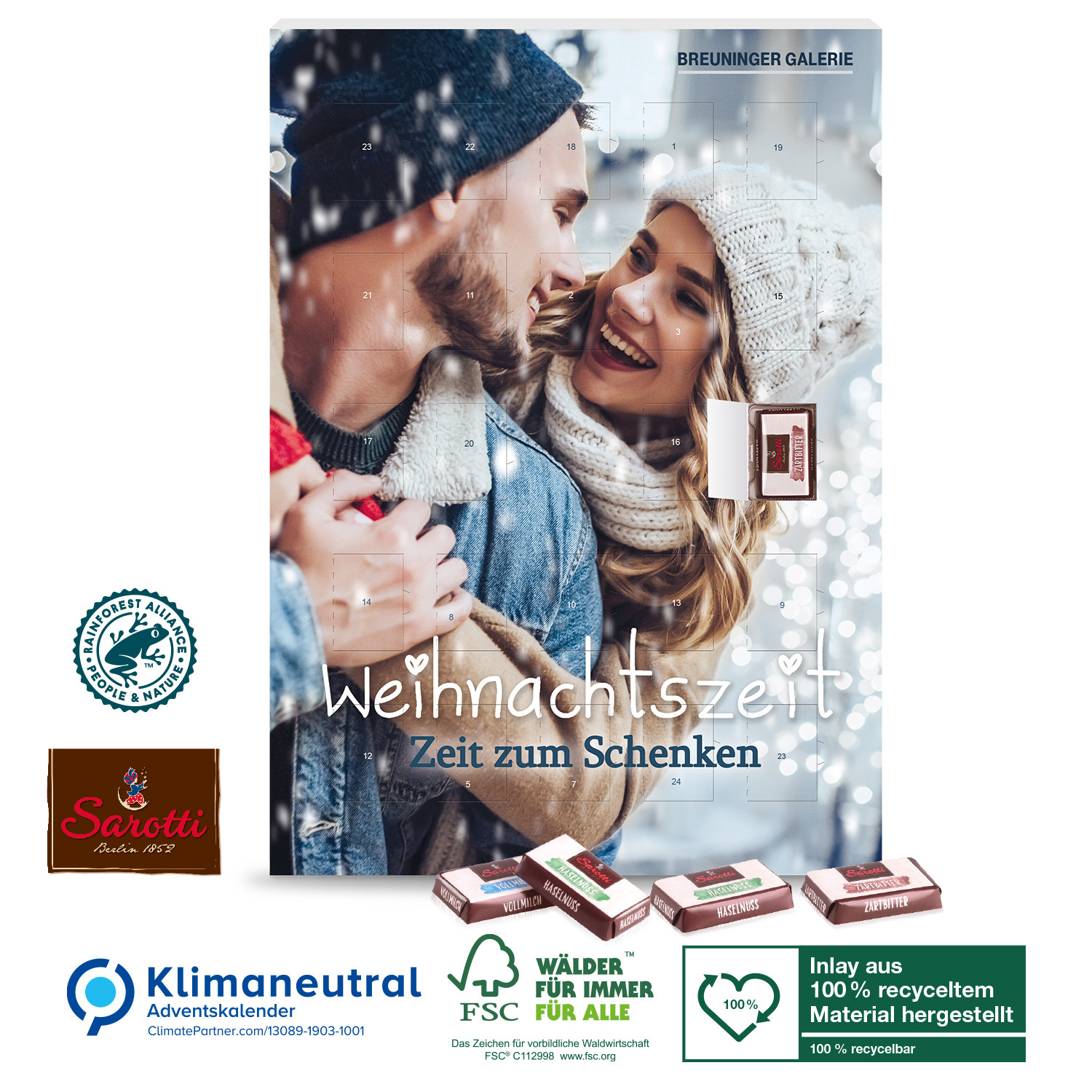 Großzügige Dimensionen, beste Werbemöglichkeiten! Dieser beliebte Adventskalender findet garantiert einen Ehrenplatz in Kunden- und Mitarbeiterbüros. Die großzügige Werbefläche, der attraktive Preis und die leckere Markenschokolade machen diesen Kalender zum Dauerbrenner. Produktdetails: Schokoladen-Adventskalender in hochwertiger Vollkartonhülle im Hoch- oder Querformat, mit Aufhängeloch und Tischaufsteller zum Ausklappen. Kalender in Aromaschutzverpackung (recycelbar, Materialdichte reduziert). Gleich mitbestellen: Stabiler Einzelkarton für den Postversand an Ihre Kunden. Nachhaltigkeit: Klimaneutrales Produkt mit finanziellem Klimabeitrag, auf FSC®-zertifiziertem Karton aus nachhaltiger Forstwirtschaft und anderen kontrollierten Quellen. Durch den Kauf von Rainforest Alliance-zertifiziertem Kakao unterstützen Sie den nachhaltigen Kakao-Anbau (www.rainforest-alliance.org). Inlay aus 100 % recyceltem Material hergestellt (z.B. aus recycelten Getränkeflaschen), 100 % recycelbar Haltbarkeit bis 31.03.2025