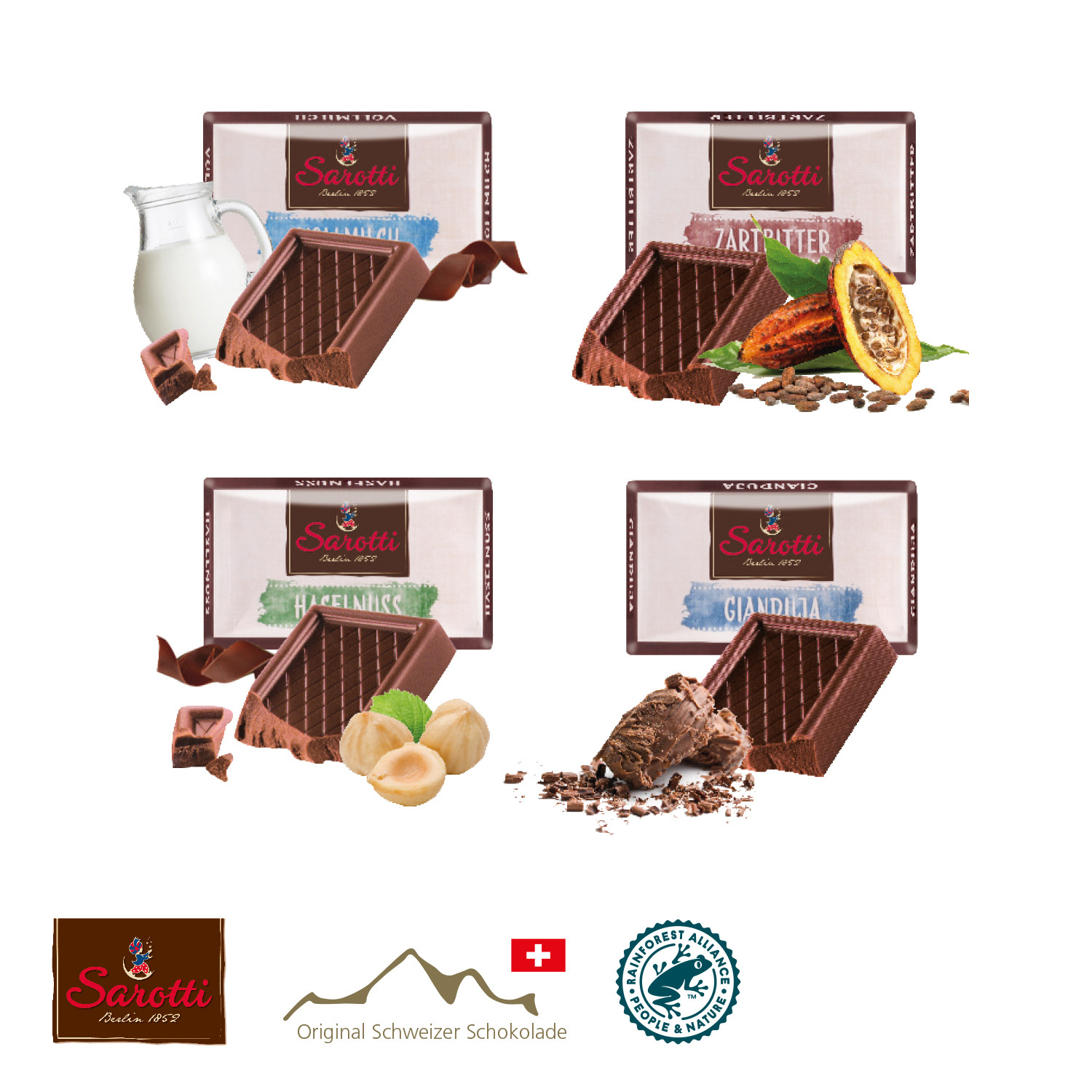 Inhalt 24 Stück (ca. 103 g) feinste Markenschokolade von Sarotti in vier ausgewählten Geschmacksrichtungen (Vollmilch, Gianduja, Haselnuss und Zartbitter gemischt)