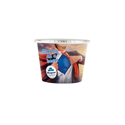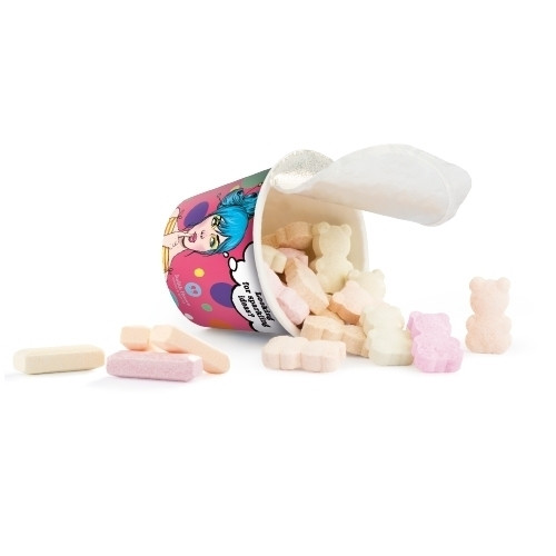 Sadex Brausebaerchen oder Brausestaebchen im Becher aus weißem Karton mit Papierbanderole, individuell bedruckt Frischeversiegelt mit Alu-Aufreißdeckel