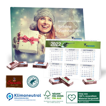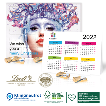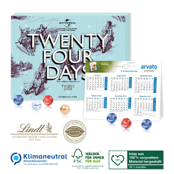 Wir haben Sie wieder im Sortiment, unsere Adventskalender. Ganz einfach Adventskalender individuell bedrucken - nach Ihren persönlichen Vorstellungen. Aus dem klassischem Wand-Adventskalender wird ein ansprechender Werbeartikel und macht Kunden oder Mitarbeiter glücklich. Egal ob Standard-Wand-Kalender, Adventskalender gefüllt mit Ritter Sport bis hin zu Lindor Mini Kugeln - wir treffen jeden Geschmack.