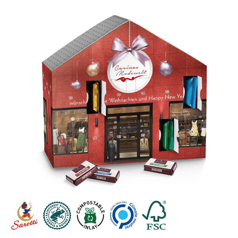 Adventskalender Haus in Vollkartonhülle mit kompostierbarem Inlay, rundum individuell bedruckt. Inhalt: 24 Sarotti Schokoladentäfelchen in 4 verschiedenen Sorten, bunt gemischt, 100 g Saisonartikel - solange der Vorrat reicht!