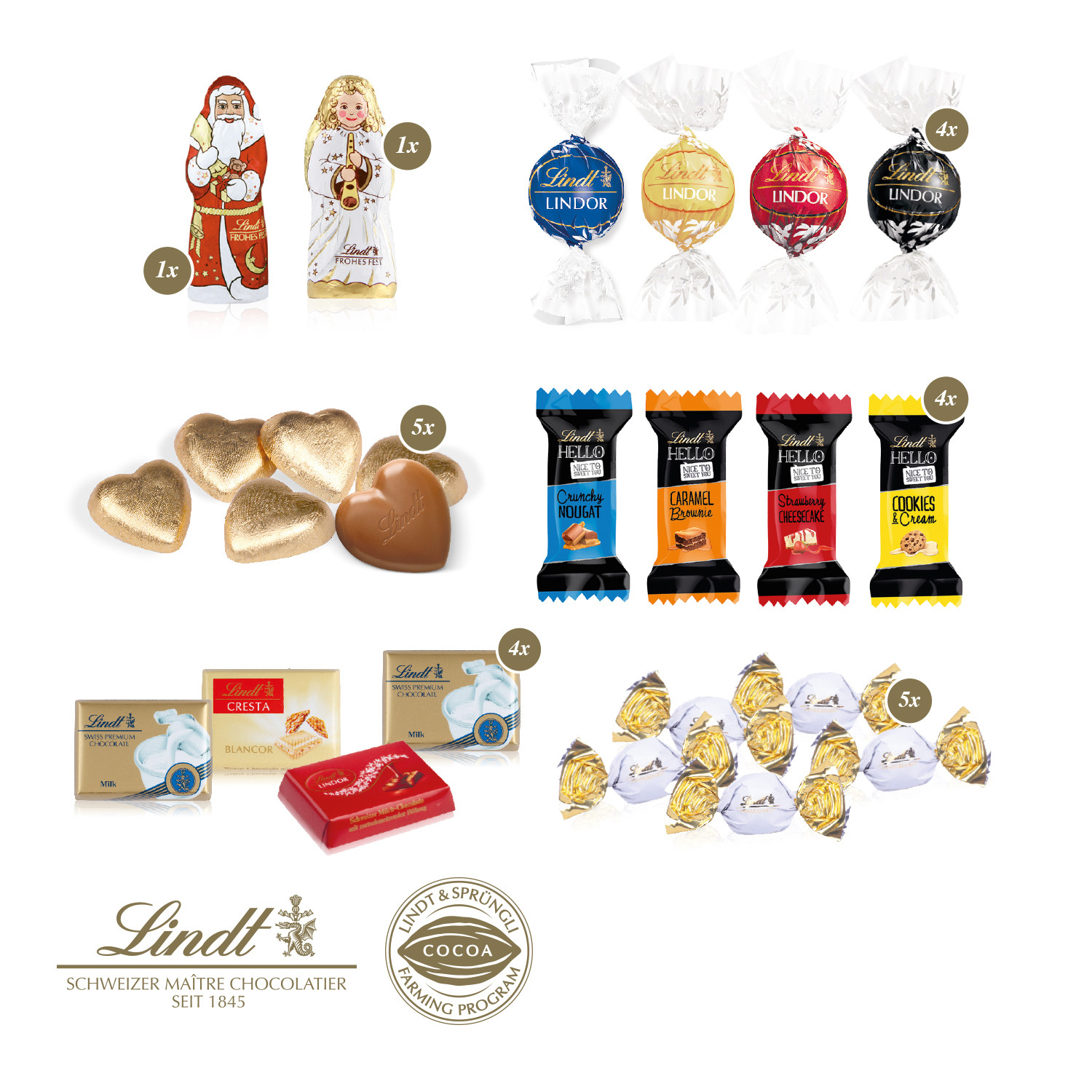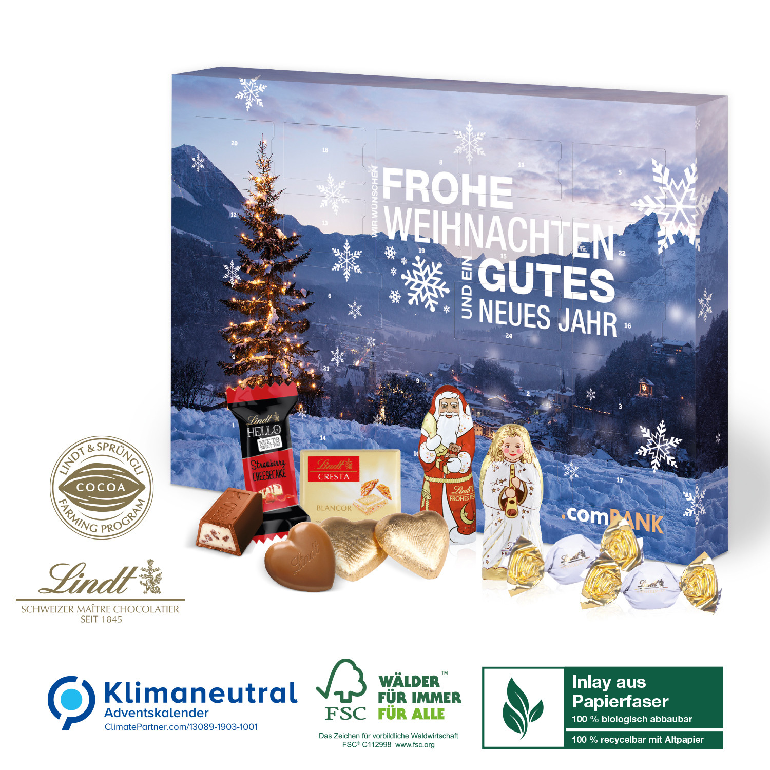 Ein unvergessliches Weihnachtspräsent! Höchste Wertschätzung und Anerkennung: Der neue Adventskalender Premium-Selection wird Ihre Kunden und Mitarbeiter begeistern. 24 zartschmelzende Lindt Spezialitäten in einer einmaligen Mischung. Die individuelle Bedruckung nach Ihren Vorlagen und Höchstpunkte beim Thema Nachhaltighkeit machen dieses Präsent unvergesslich. Nachhaltigkeit: Klimaneutrales Produkt, gefertigt auf FSC®-zertifiziertem Karton aus nachhaltiger Forstwirtschaft. Das Lindt & Sprüngli Farming-Programm steht für nachhaltige Kakaobohnen-Beschaffung (www.farming-program.com). Inlay 100 % biobasiert, aus nachwachsenden Rohstoffen hergestellt, biologisch abbaubar und kompostierbar nach DIN EN 13432. 100 % recycelbar, Entsorgung zusammen mit Altpapier