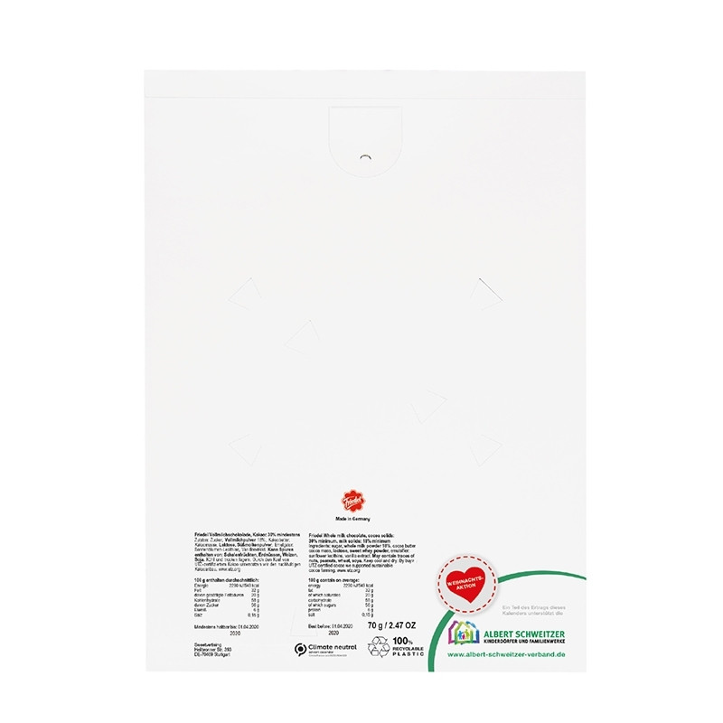 | Inhalt | 24 UTZ-zertifizierte Vollmilch Schokoladentäfelchen der Marke Friedel, 70 g Saisonartikel - solange der Vorrat reicht! |