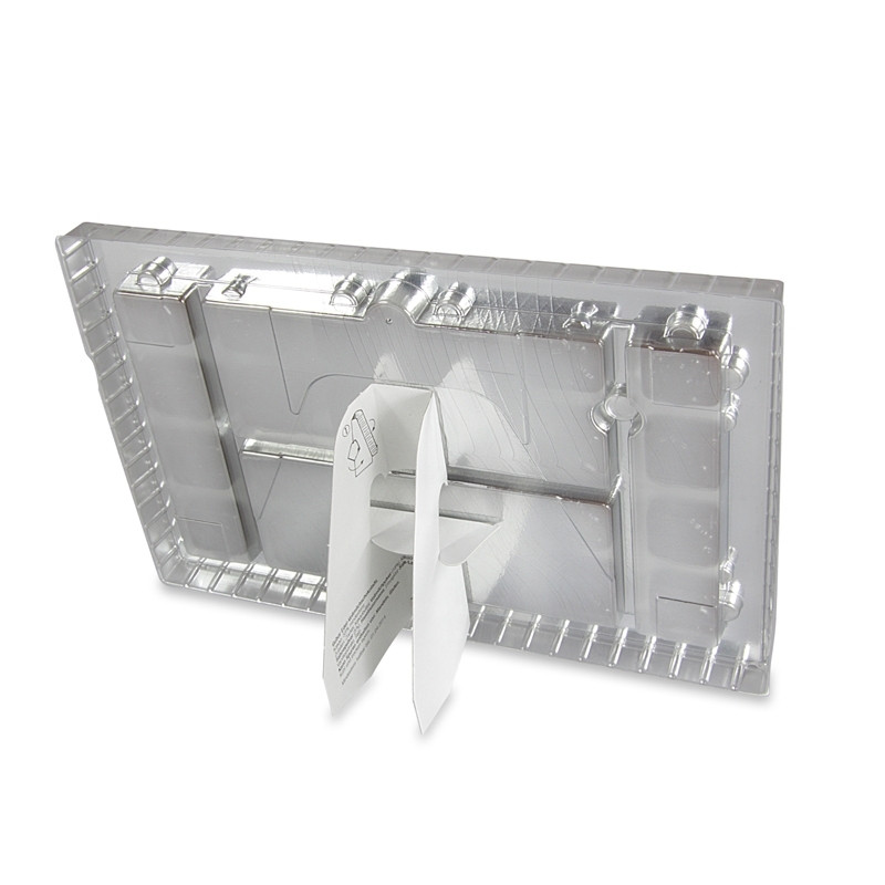 Tiefziehteil aus edlem Chromglanz oder in Weiß mit praktischem Stehfuß zum Ausklappen auf der Rückseite