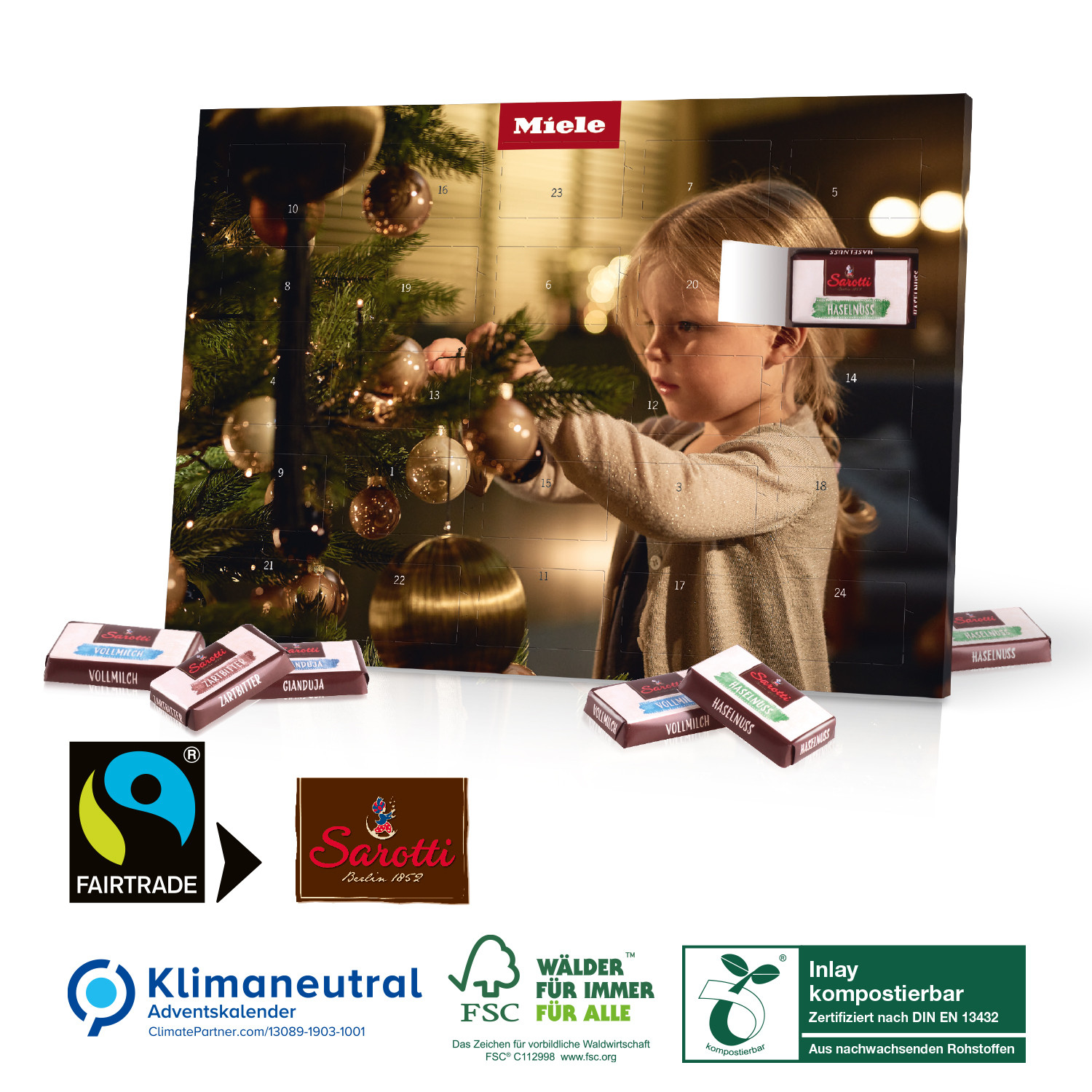 Nachhaltig und in Markenqualität! Die beliebte Sarotti-Schokolade in vier Geschmacksrichtungen ist ein Schweizer Original und äußerst beliebt. Unsere neue Fairtrade-Variante verspricht 24 nachhaltige Genussmomente. Klimaneutral produziert, gedruckt auf FSC®-zertifiziertem Karton und mit einem kompostierbarem Inlay, ein ideales nachhaltiges Weihnachtspräsent. Nachhaltigkeit: Klimaneutrales Produkt. FSC®-zertifizierter Karton aus nachhaltiger Forstwirtschaft. Durch den Kauf von Fairtrade®-zertifiziertem Kakao unterstützen Sie den nachhaltigen Kakao-Anbau (www.fairtrade-deutschland.de). Inlay aus nachwachsenden Rohstoffen, kompostierbar nach DIN EN 13432