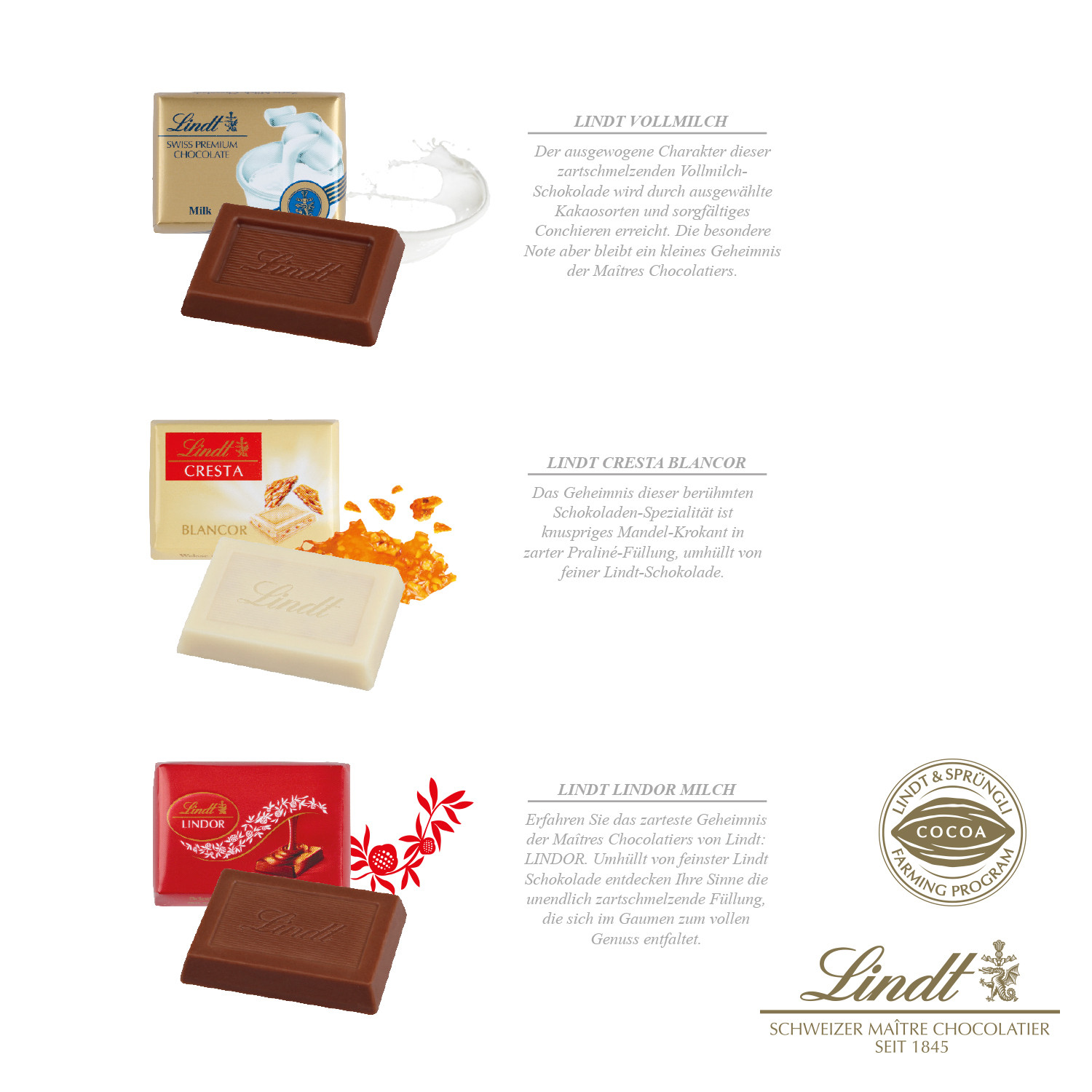 Feinste Schokolade von den Maîtres Chocolatiers Suisse! Die Maître Chocolatiers von Lindt stehen seit über 170 Jahren für höchste Confiserie-Kunst. Unvergleichlich zart ist der feine Schmelz der edlen Lindt Schokolade. Drei exklusive Sorten versprechen himmlische Genussmomente. Das ideale Geschenk für ganz besondere Menschen. Produktdetails: Schokoladen-Adventskalender in hochwertiger Vollkartonhülle im Hoch- oder Querformat, mit Aufhängeloch und Tischaufsteller zum Ausklappen. Kalender in Aromaschutzverpackung (recycelbar, Materialdichte reduziert). Gleich mitbestellen: Einzelversandkarton für den Postversand. Nachhaltigkeit: Klimaneutrales Produkt mit finanziellem Klimabeitrag, auf FSC®-zertifiziertem Karton aus nachhaltiger Forstwirtschaft und anderen kontrollierten Quellen. Das Lindt & Sprüngli Farming-Programm steht für nachhaltige Kakaobohnen-Beschaffung (www.farming-program.com). Inlay aus 100 % recyceltem Material hergestellt (z.B. aus recycelten Getränkeflaschen), 100 % recycelbar Haltbarkeit bis 31.03.2025