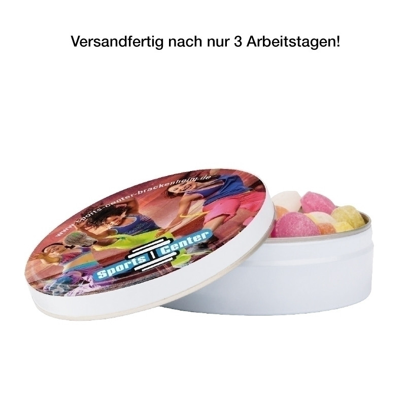 Bonbons in runder Dose mit Stuelpdeckel, weiß aus Metall, individuell bedruckt Frische-Versiegelung rundum mit Etikett