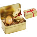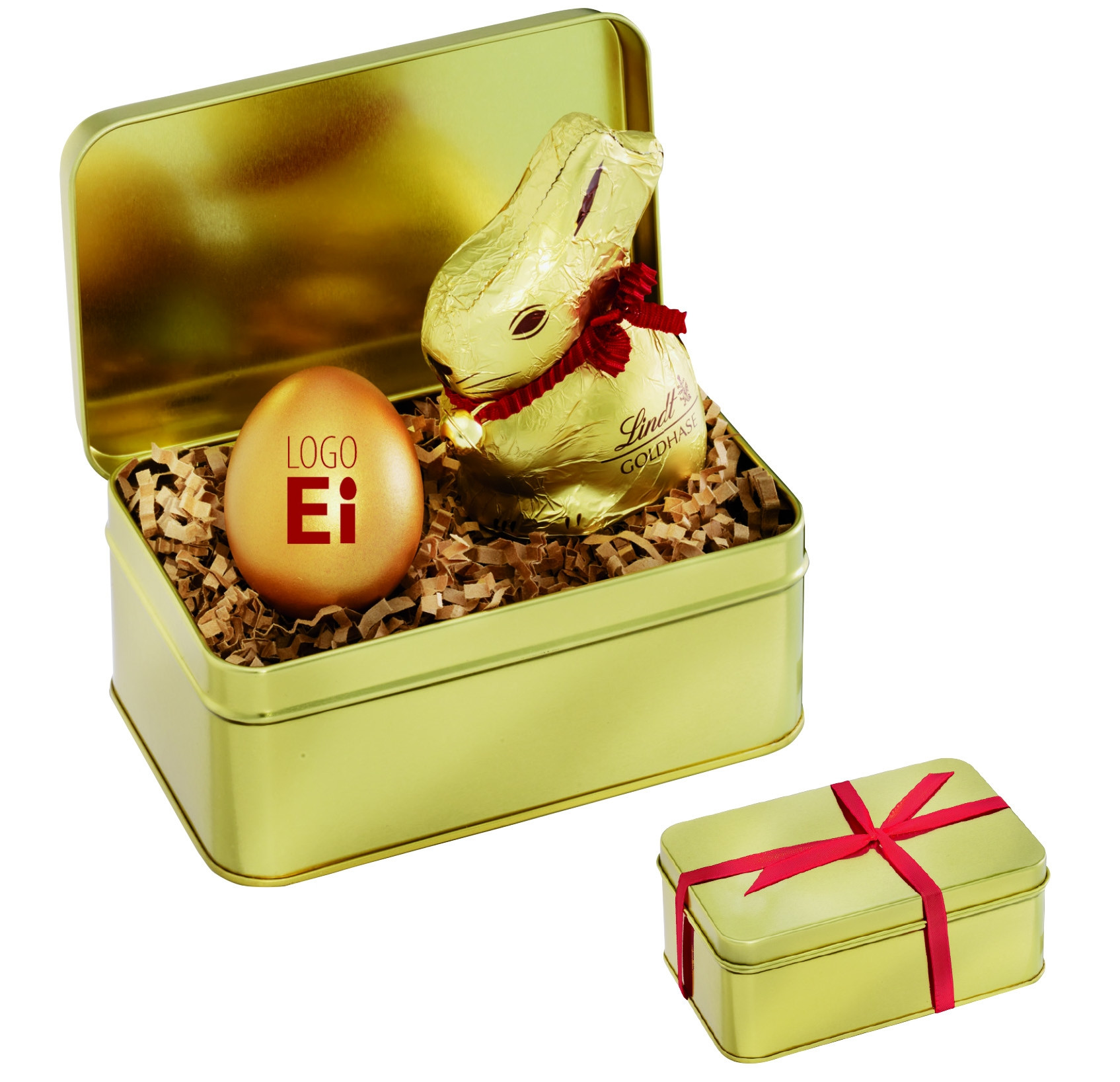 Exklusives Qualitäts Ei mit Ihrem Logo/Design und einem Lindt Goldhasen hochwertig in eleganter Golddose verpackt.