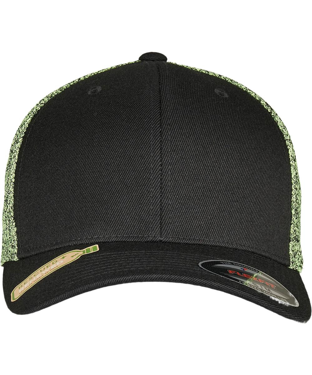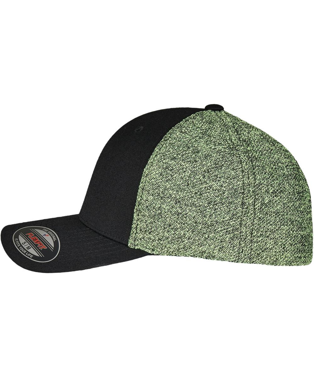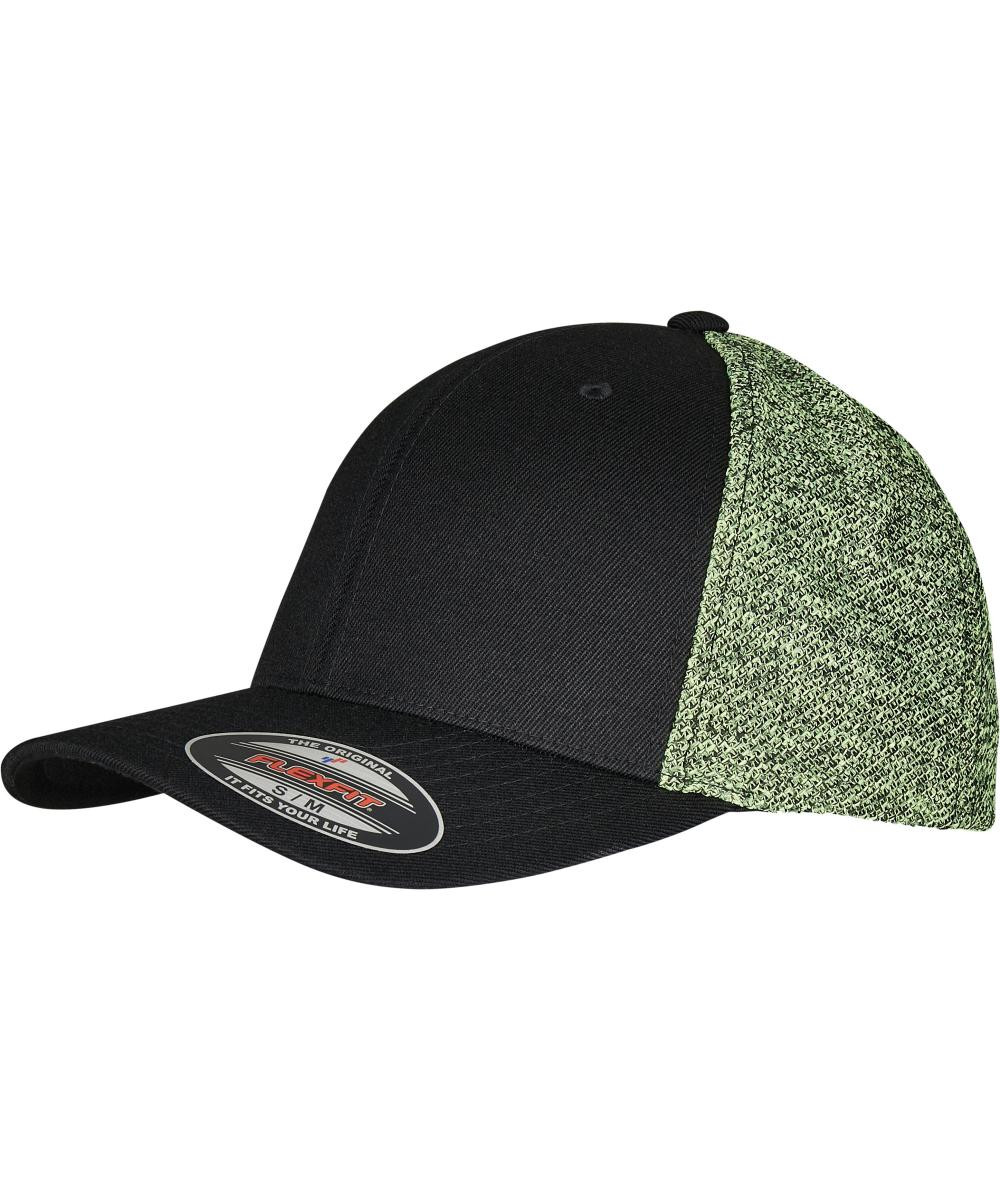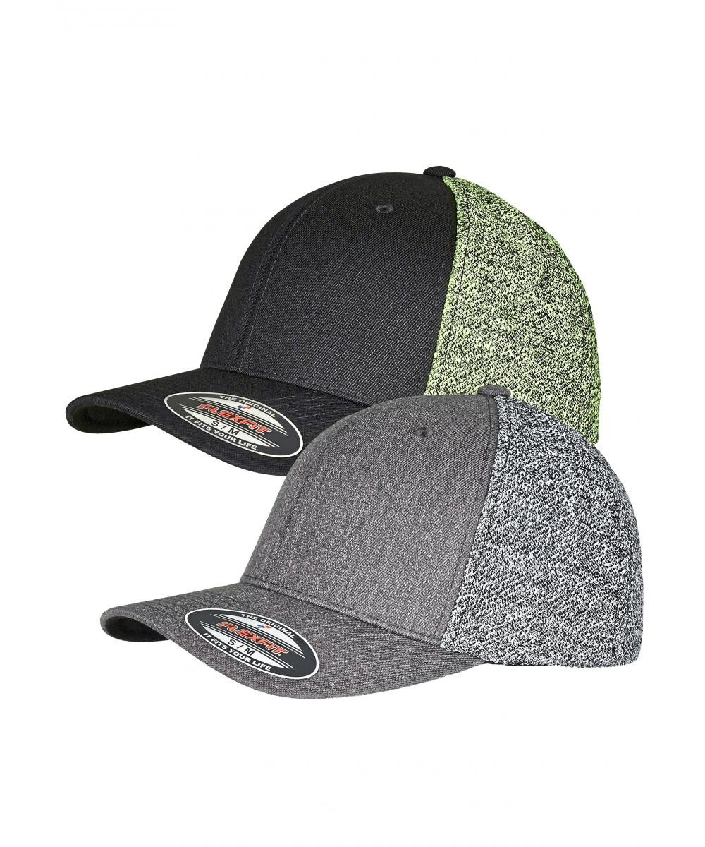 Zweigeteilte Flexfit Kappe: vorne klassisch einfarbig und Rückseite mit einem Melange Tech Material | Vorgebogener Schirm