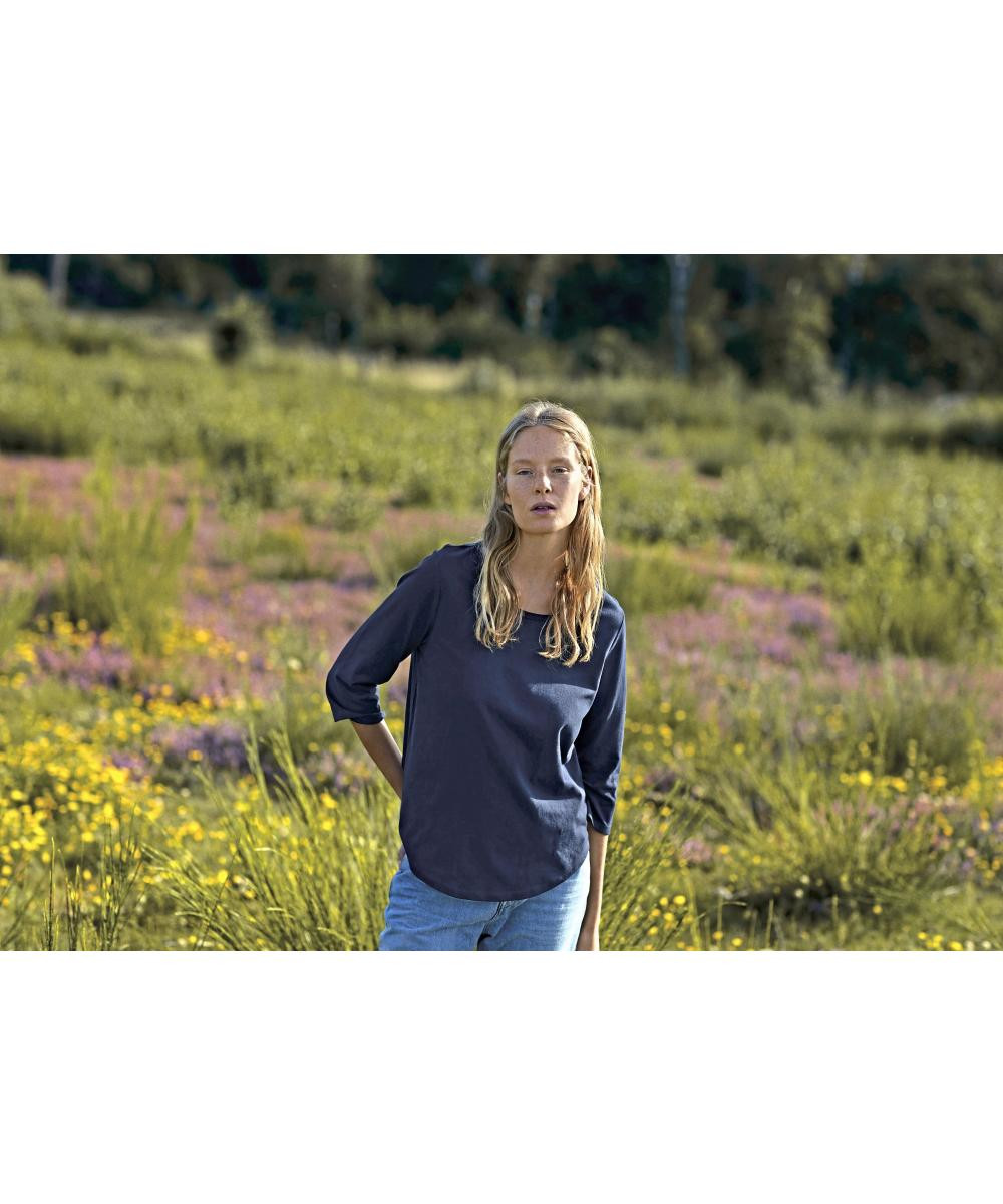 Fairtrade-zertifizierte Baumwolle | Zertifizierte, gekämmte Bio-Baumwolle | Single-Jersey Strick | 3/4-Ärmel | Elasthan Ripp am Halsausschnitt | Nackenband innen