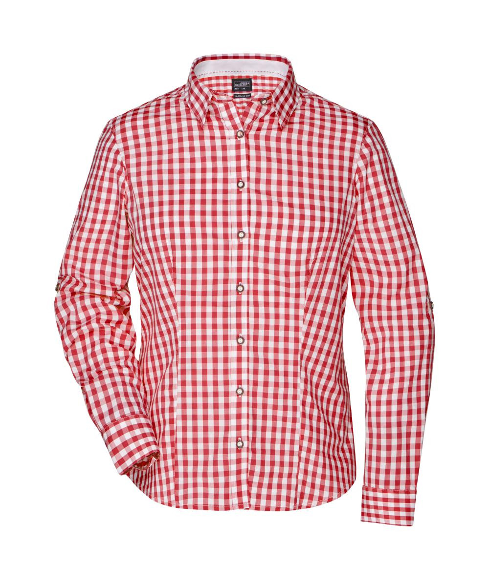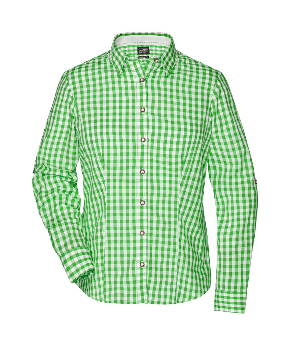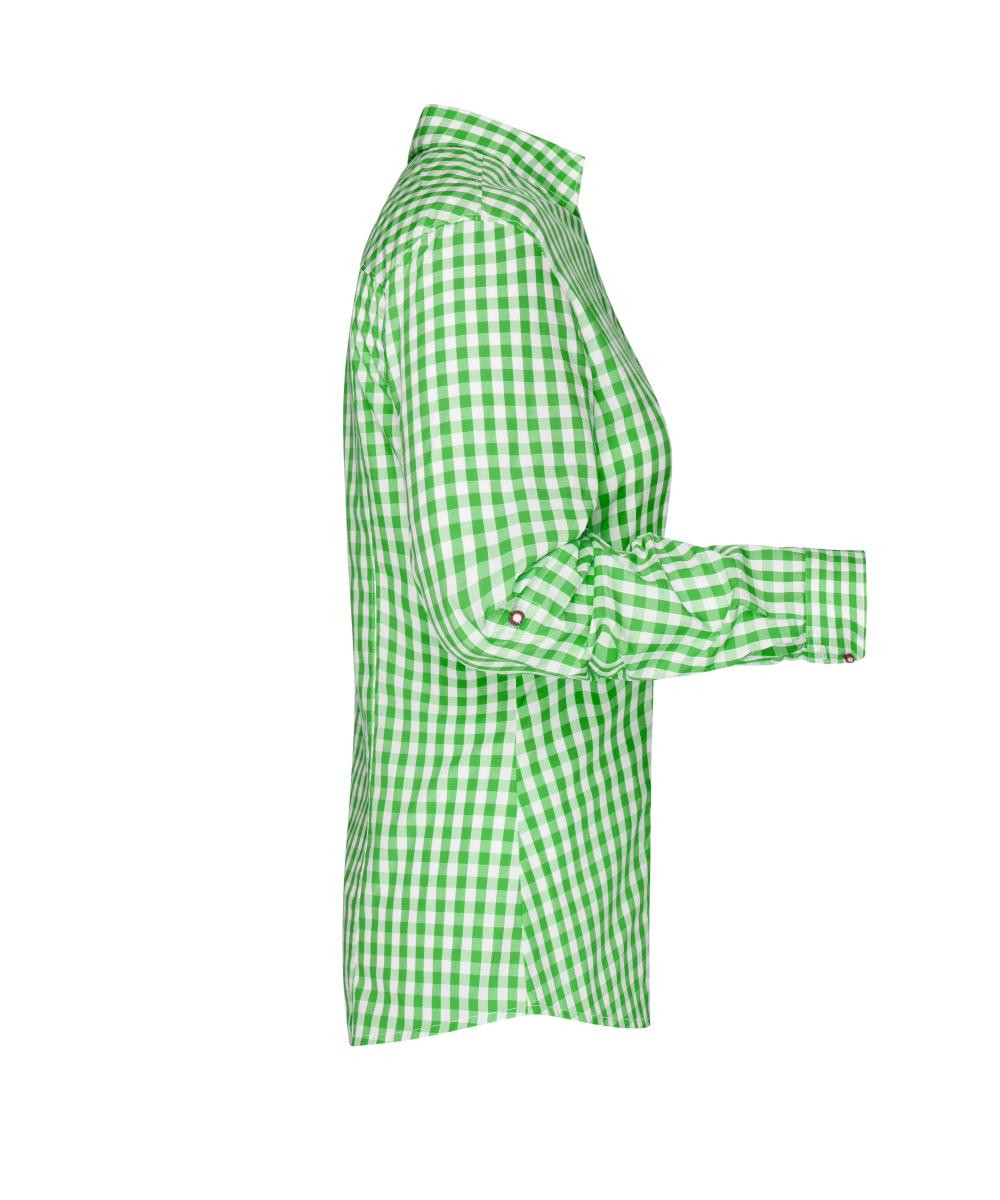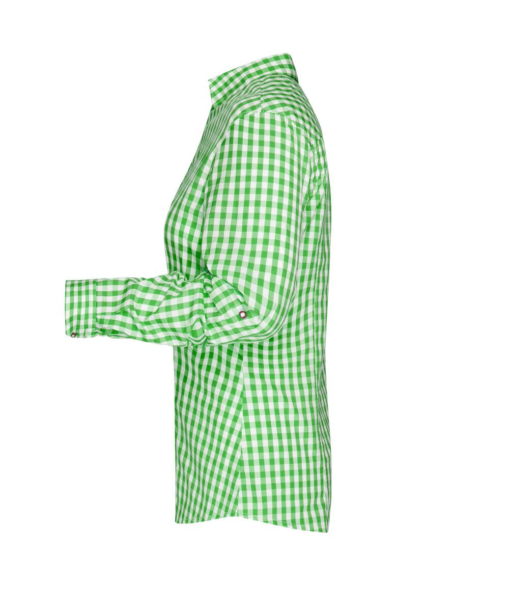 Damen-Bluse im klassischen Trachtenlook | Hochwertige, bügelleichte Popeline-Qualität mit Easy-Care Finish | Ärmel zum Hochkrempeln mit Lasche und Knopf | Abgerundeter Saum | Trachtenknöpfe aus Horn-Imitat | Taillierter, femininer Schnitt