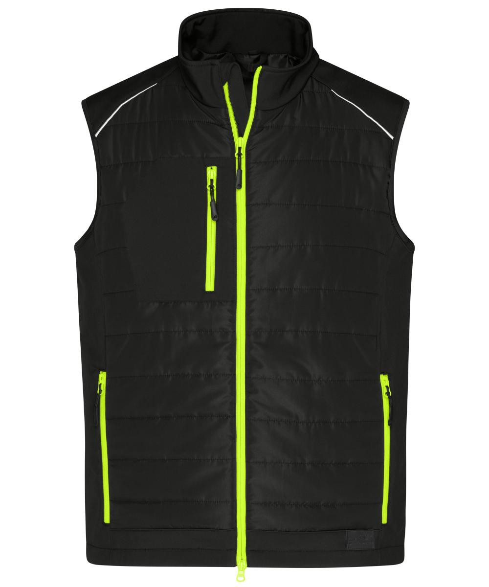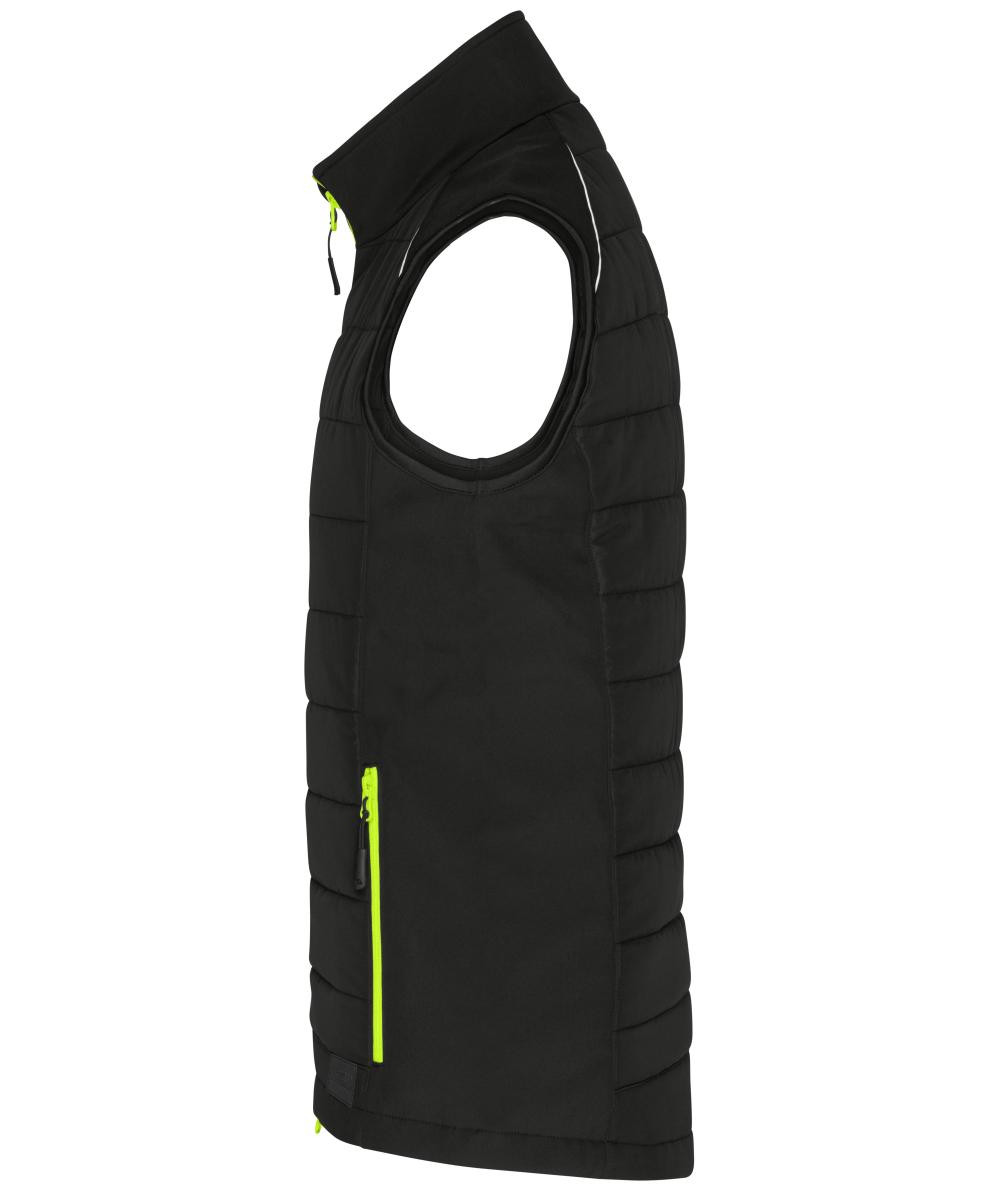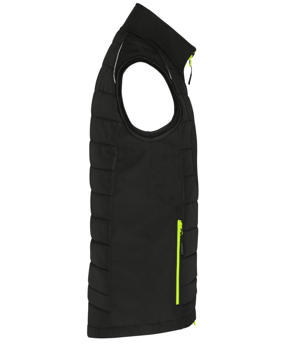 Oberstoff + Futterstoff: recyceltes Polyester, Wattierung: Polyester | Softshell-Weste im attraktiven Materialmix | Pflegeleichtes 2-Lagen Softshell-Material kombiniert mit gesteppten Einsätzen im Vorder- und Rückenteil | Wasser- und schmutzabweisend durch BIONIC-FINISH®ECO | Wärmende DuPont™Sorona® Wattierung | Stehkragen | Durchgehend unterlegter 2-Wege Reißverschluss mit Windschutzblende und Kinnschutz | Weitenregulierung am Saum | Seitentaschen und Brusttasche mit Reißverschluss, eine Innentasche mit Klettverschluss | Reflektions-Elemente (keine Schutzfunktion, keine PSA) an Vorder- und Rückenteil | Reißverschluss zur Rückenveredelung | YKK-Reißverschlüsse