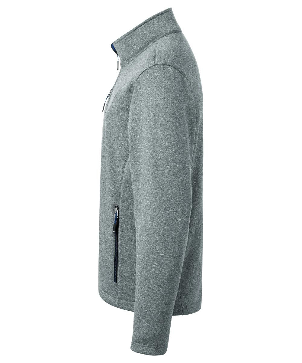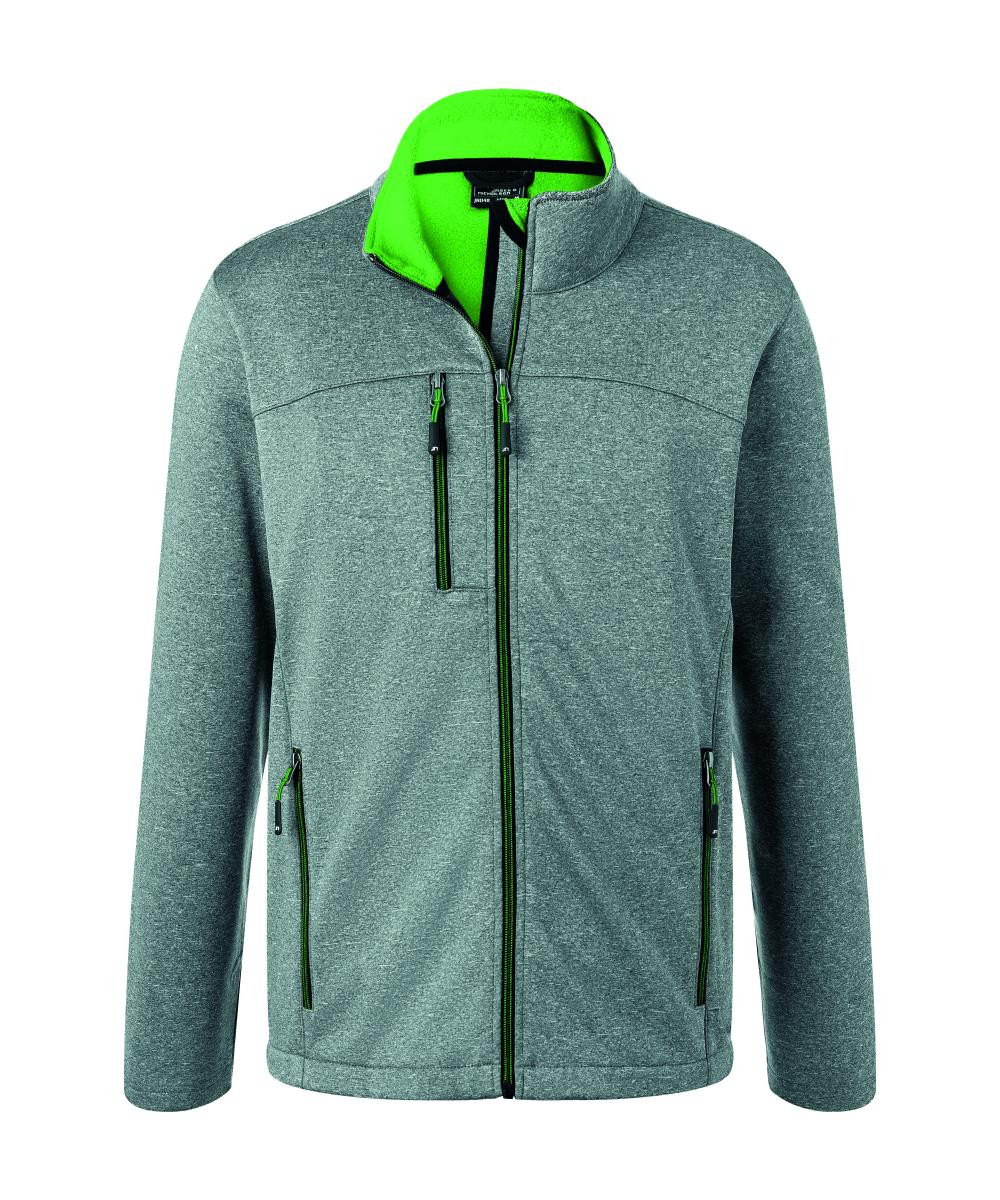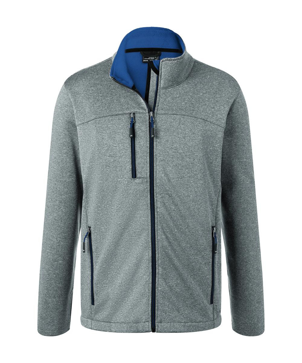 Softshelljacke in Melange-Optik | Angenehmes, weiches, 2-lagiges Softshellmaterial | Fleece-Innenseite in Kontrastfarbe | Durchgehend hinterlegter Front-Reißverschluss mit Kinnschutz | Stehkragen | Zwei seitliche Taschen und eine Brusttasche mit Reißverschluss | Leicht tailliert