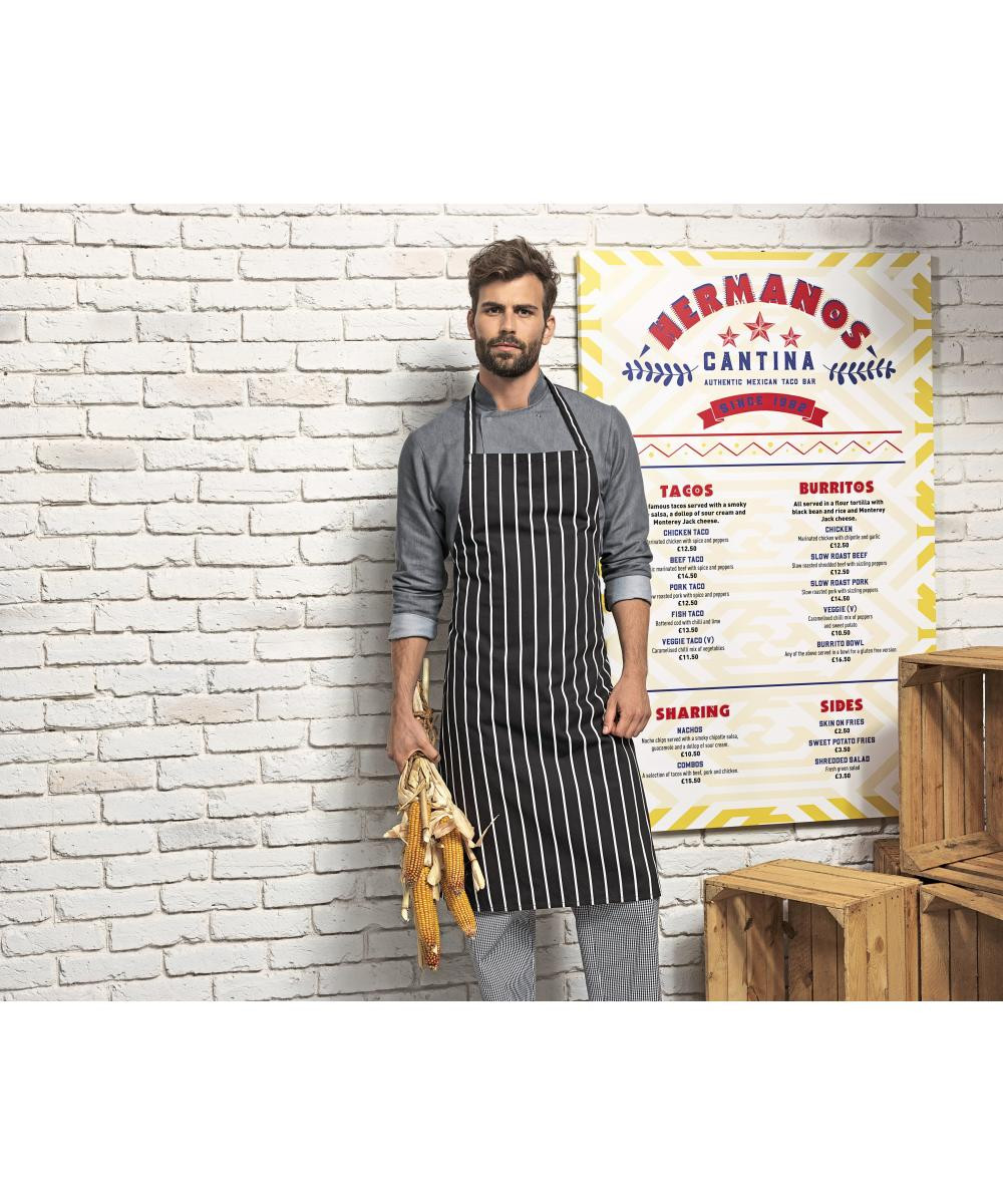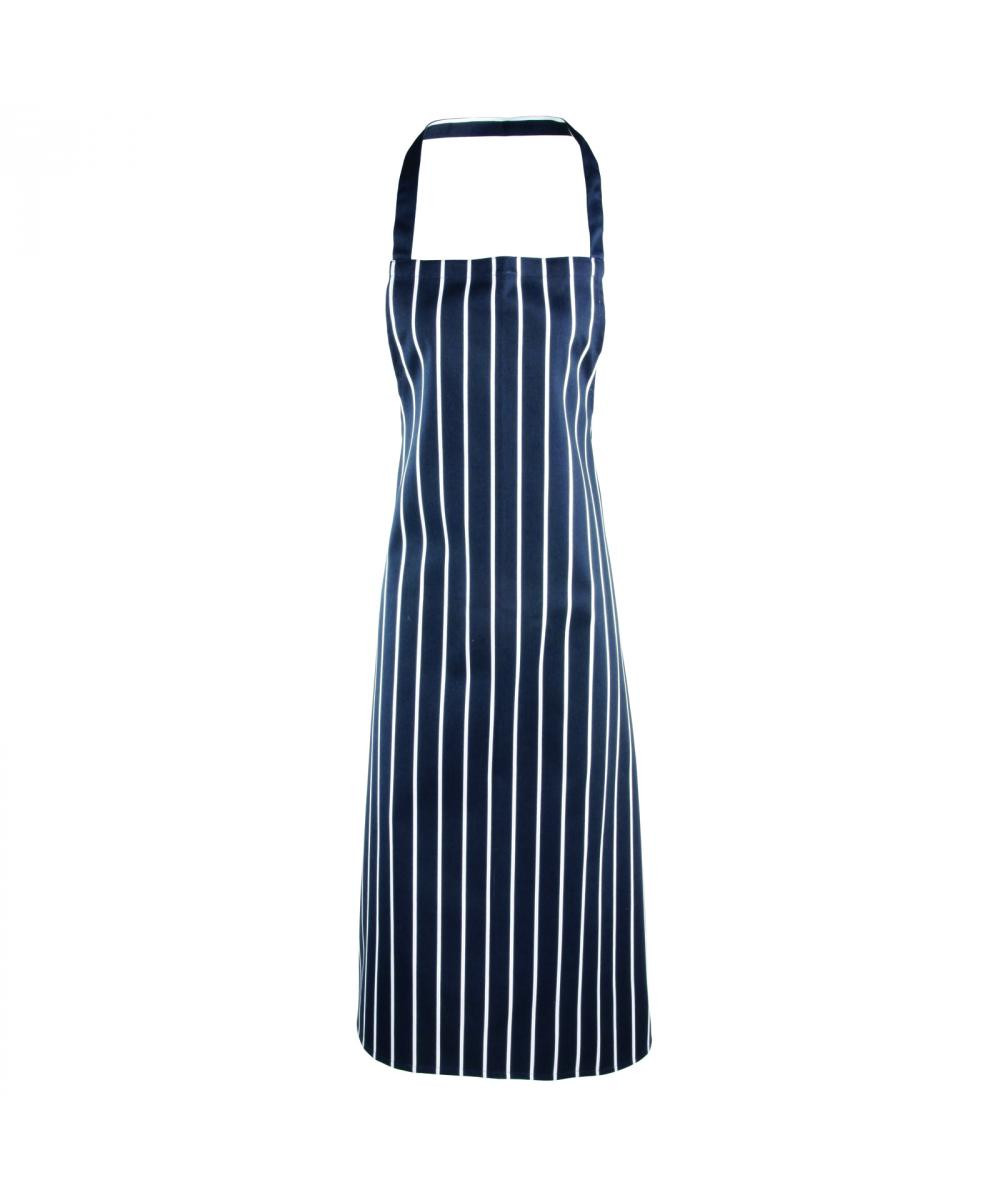 Aufgedruckte Streifen im „Butchers“-Stil | Stoffgleiches Nackenband | 90 cm Schlaufenbänder aus Hauptmaterial | Breite 72 cm | Länge ab Taille: 71 cm | Gesamtlänge: 101 cm | WRAP-Zertifizierung
