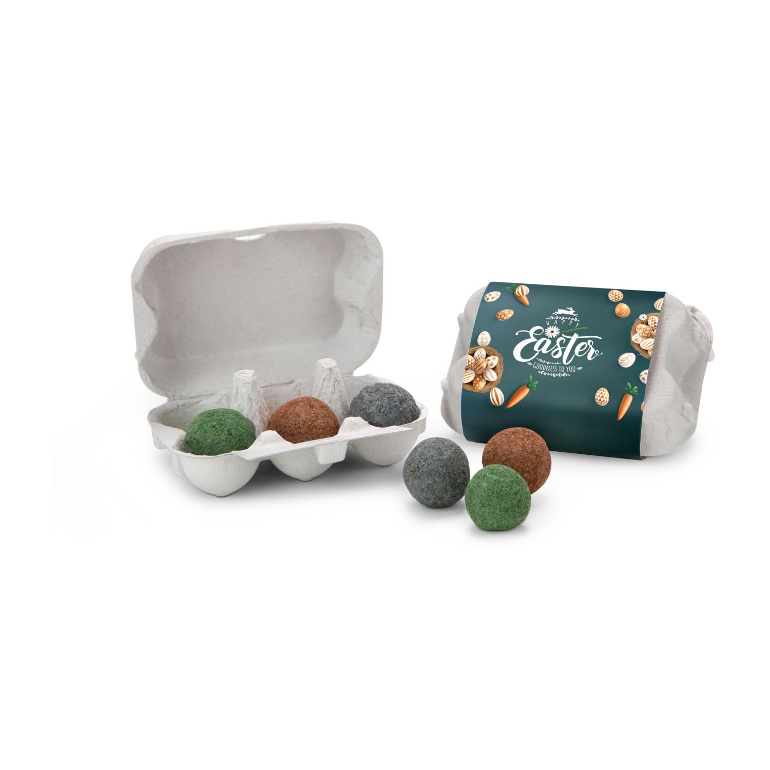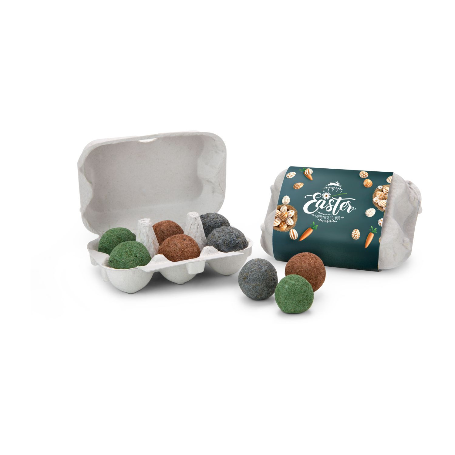 Osternest ohne Kalorien: Mini-Eierschachtel mit Happy-Easter Banderole und 6 farbigen Saatgutbomben für eine Bienenwiese
