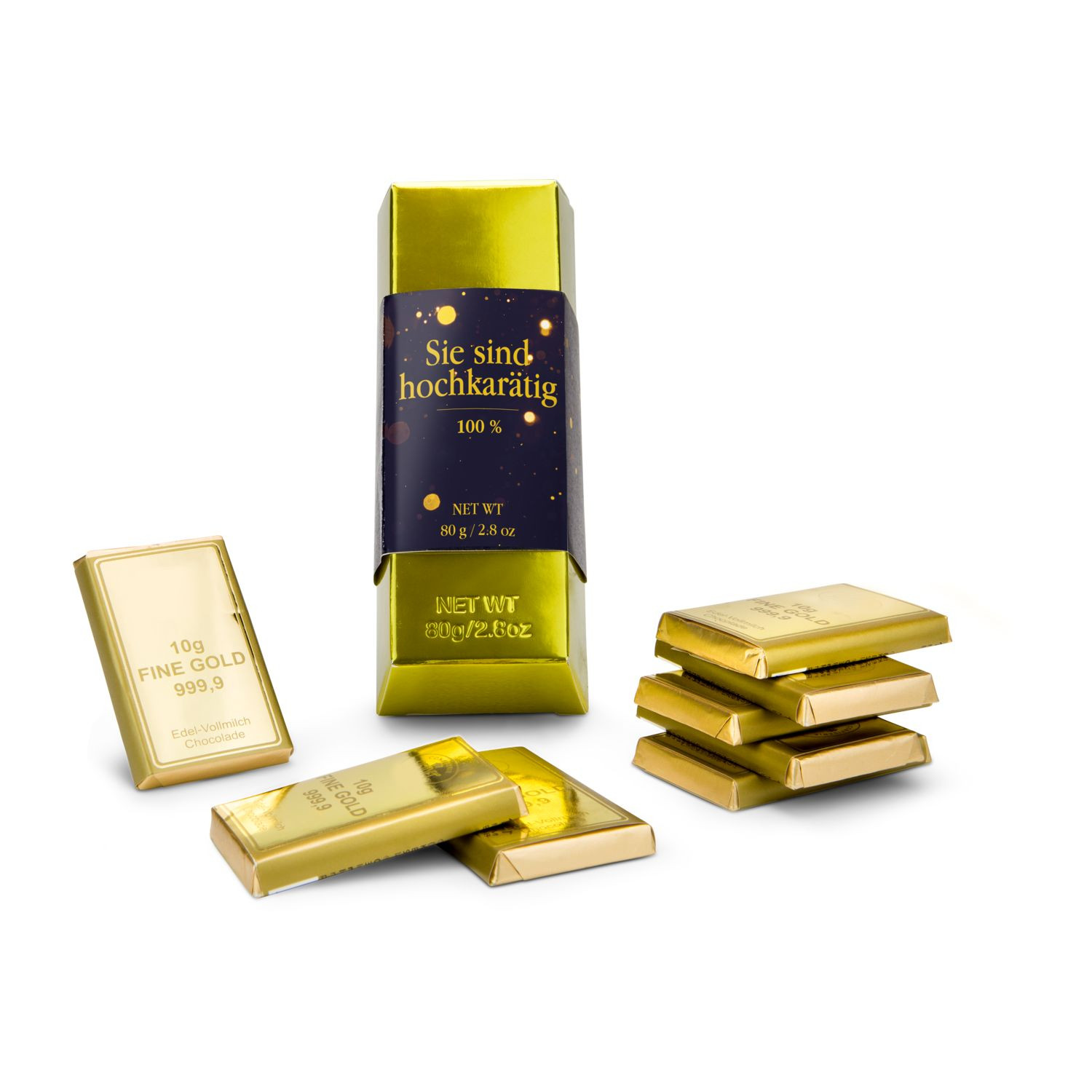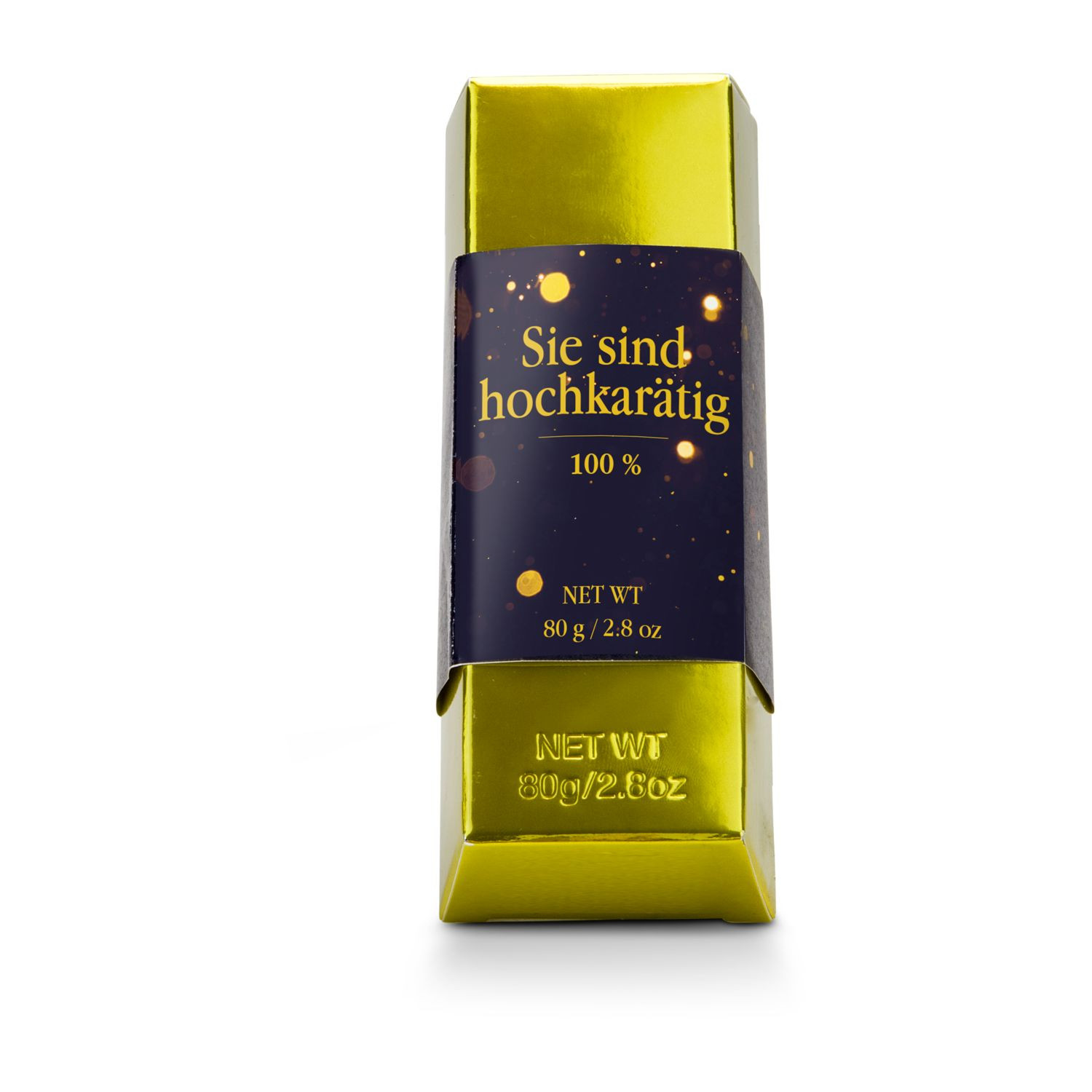 100% Wertschätzung! Schokolade (80 g) im Goldbarren. Erhältlich mit 'Du bist hochkarätig' und 'Sie sind hochkarätig' Banderole.