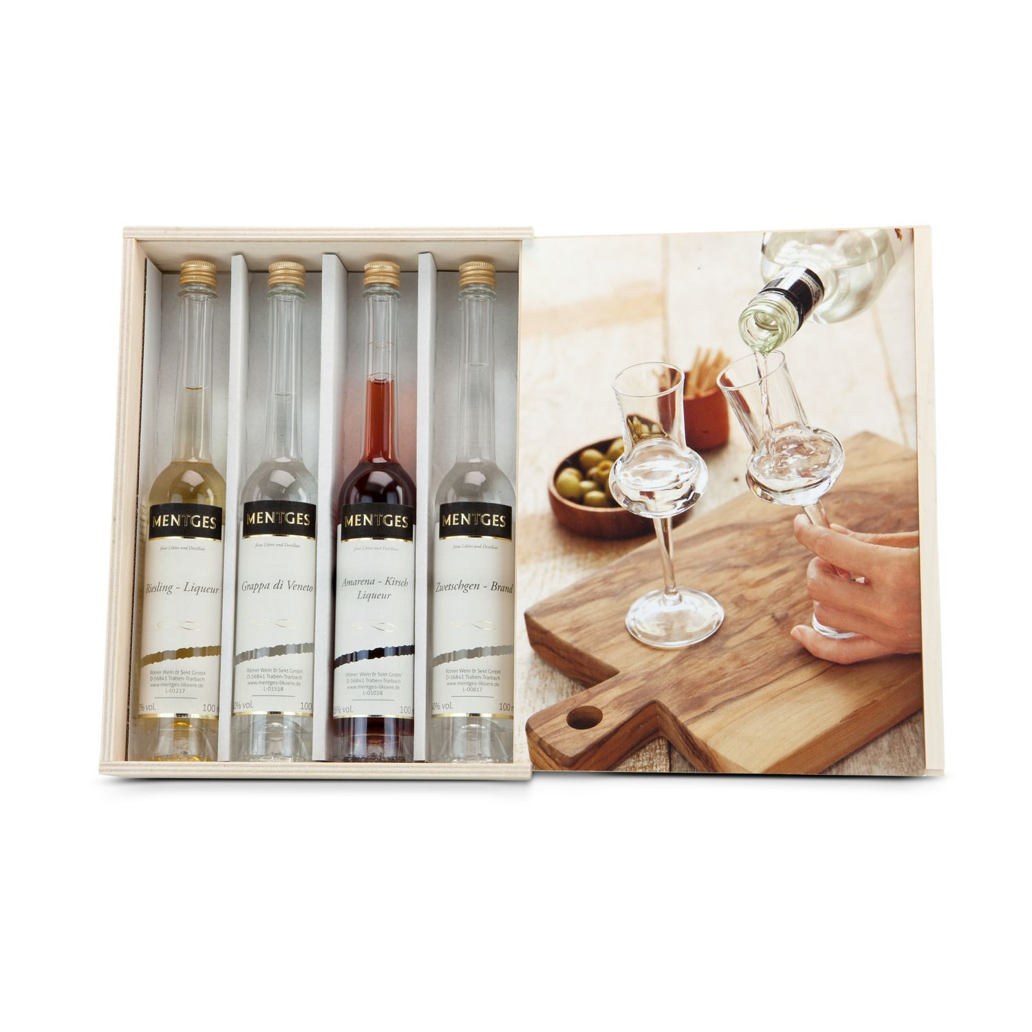 Ein Erlebnis für Genießer: 2 Brände und 2 Liköre von MENTGES liegen in einer Holzkiste mit Schiebedeckel und stimmungsvollem Deckelaufleger. Probieren Sie Grappa, Zwetschge, Rieslinglikör und Amarena Kirschlikör (je 100 ml) und bestimmen Sie Ihren Favoriten. Der Deckelaufleger ist auch individuell gestaltbar - Sprechen Sie uns an.