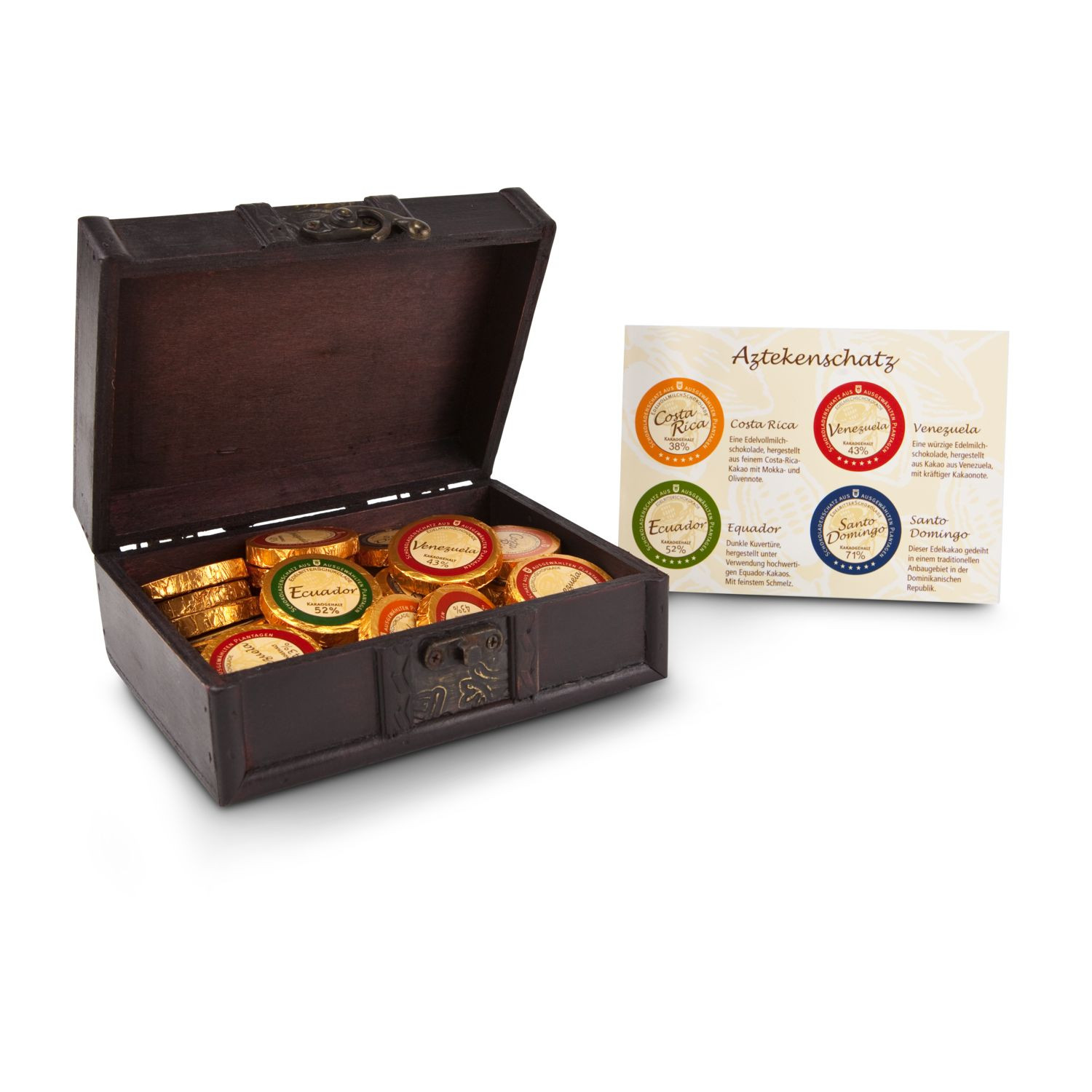 Was enthält diese kleine Schatztruhe? 24 leckere Schoko-Gold-Dublonen mit Kakao-Anteilen zwischen 38% und 71%: „Costa Rica”, „Venezuela”‚„Ecuador” und „Santo Domingo” (insgesamt 192 g). Ein echter Aztekenschatz!