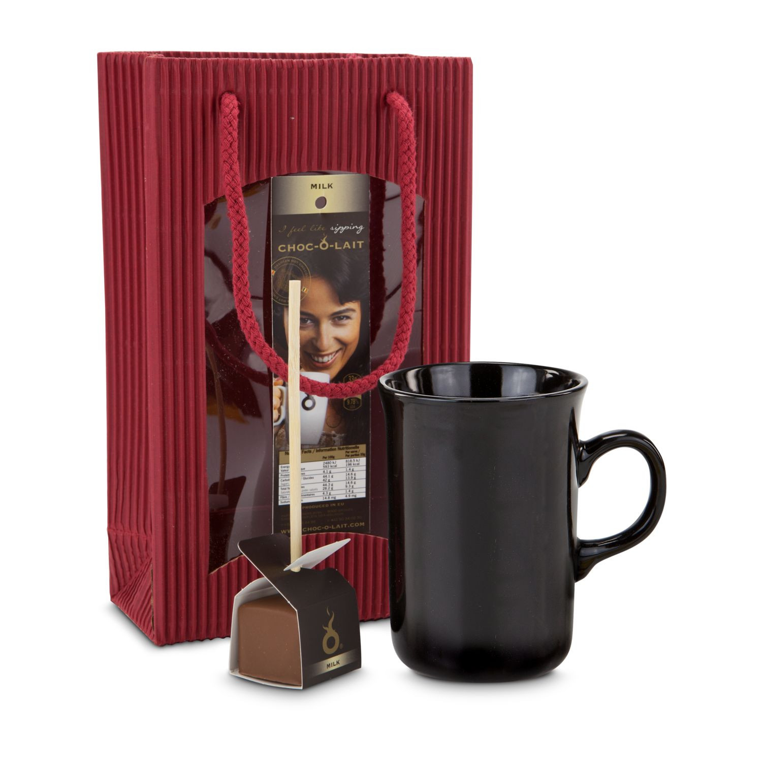 Eine nette Aufmerksamkeit für alle, die Heiße Schokolade lieben: die Tasse mit frisch gekochter heißer Milch füllen, den Schokostick eintauchen, aufrühren und genießen. Stick und Tasse können Sie in der bordeaux-farbenen Geschenktüte überreichen.