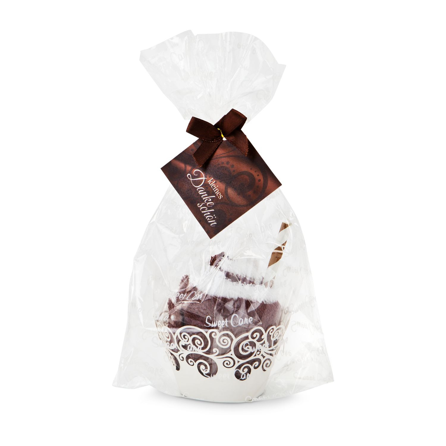 Ein Cupcake ganz ohne Kalorien und schlechtes Gewissen. Eine originelle Geschenkidee, die garantiert für Freude sorgt. Zwei Gesichtstücher in Weiß und Braun (ca. 20 x 20 cm und 30 x 30 cm) wurden geschickt zu einem kleinen, schmackhaften Muffin gerollt. Als dekoratives Highlight wurde der kleine Kuchen noch mit einem „Schokoröllchen” garniert. Die Handtuchtorte kommt hübsch verpackt in transparenter Geschenkfolie mit Schleife und ist somit direkt Übergabe bereit bei jeder Gelegenheit.