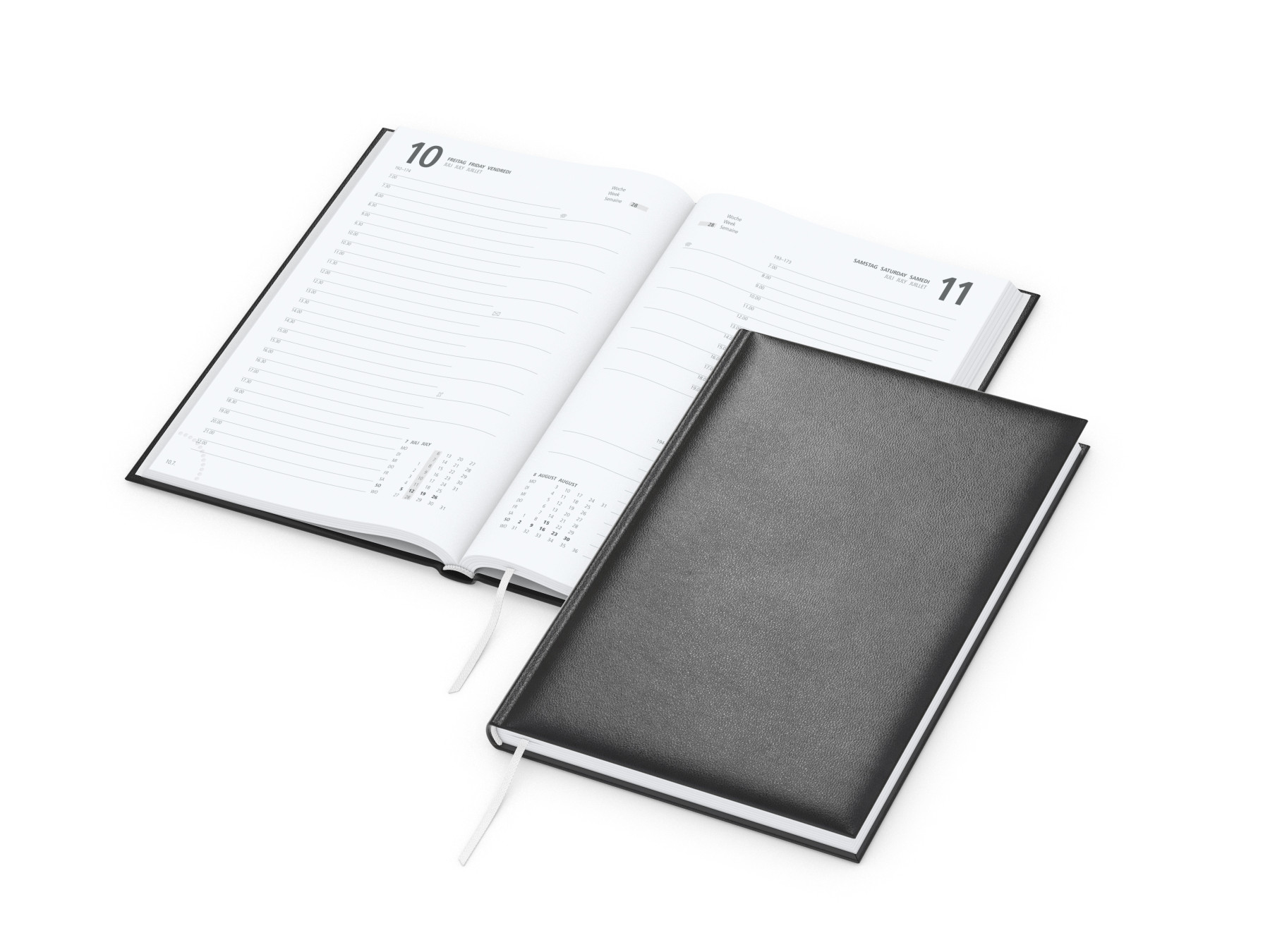 Kalendarium: Deutsch 3sprachig D/GB/F, je Tag eine Seite, Samstag und Sonntag zusammengefasst, Halbstunden-Einteilung von 7 bis 22 Uhr, Informationsteil. Umfang: 320 Seiten. Verarbeitung: Hardcover mit wattierter Buchdecke, Eckenperforation, Lesezeichen, Kapitalband, runder Rücken. Format: 148 x 210 mm gesamt (DIN A5), 142 x 205 mm Kalenderblock. Einband: Balacron schwarz (Alternativ: dunkelblau). Werbefläche: 100 x 50 mm. Druck: Siebdruck-Digital inklusive. Hinweis: Qualität „Made in Germany“