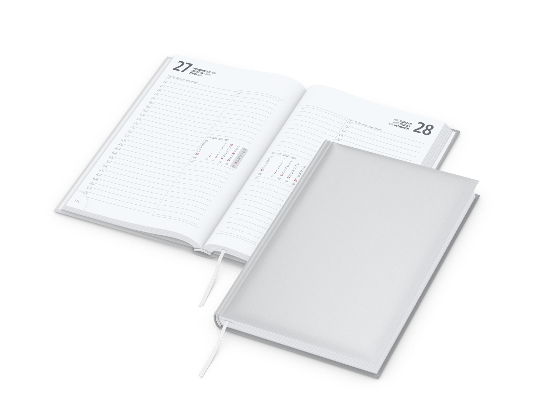 Kalendarium: Deutsch 3sprachig D/GB/F. Umfang: 352 Seiten. Verarbeitung: Hardcover mit wattierter Buchdecke, Eckenperforation, Lesezeichen, Kapitalband, runder Rücken. Format: 148 x 210 mm gesamt (DIN A5), 142 x 205 mm Kalenderblock. Einband: Cover-Star gloss-individuell (auf Wunsch matt-individuell, ohne Mehrpreis). Werbefläche: kompletter Einband außen. Druck: 4C-Quality-Digital inklusive. Hinweis: Qualität „Made in Germany“