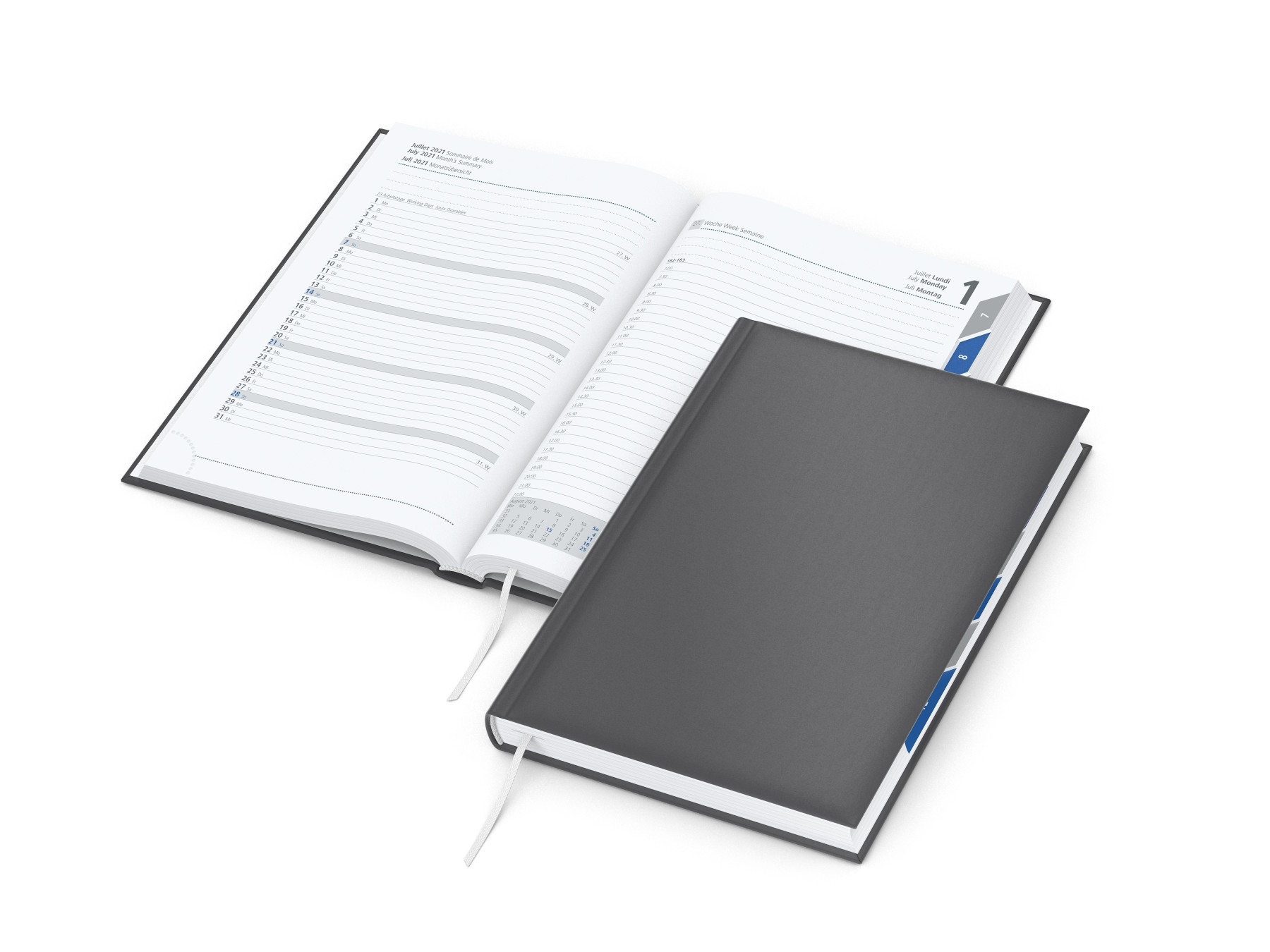 Kalendarium: Deutsch 3sprachig D/GB/F, je Tag eine Seite (auch Samstag und Sonntag), Halbstunden-Einteilung von 7 bis 22 Uhr, vor jedem Monat eine Monatsübersicht, Informationsteil. Umfang: 416 Seiten. Verarbeitung: Hardcover mit wattierter Buchdecke, Monats-Registerstanzung, Eckenperforation, Lesezeichen, Kapitalband, runder Rücken. Format: 148 x 210 mm gesamt (DIN A5), 142 x 205 mm Kalenderblock. Einband: Future anthrazit. Werbefläche: 100 x 50 mm. Druck: Siebdruck-Digital. Hinweis: Qualität „Made in Germany“