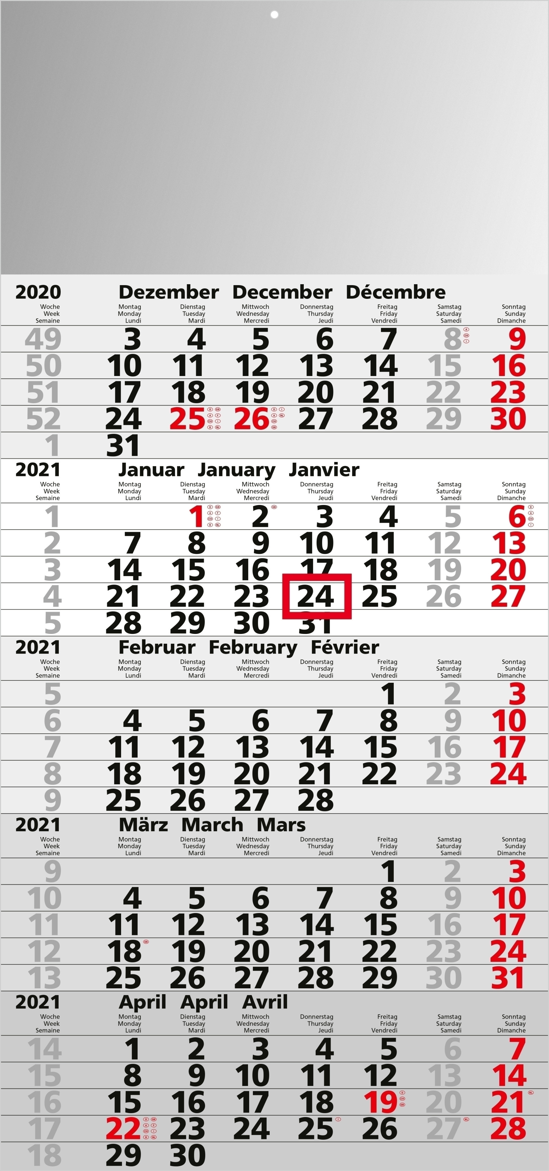 Kalendarium: Deutsch 3sprachig D/GB/F - hellgrau. Ausstattung: Datumsschieber rot. Format: 300 x 640 mm gesamt, 300 x 500 mm Kalendarium. Druck: 4C-Quality Digital inklusive. Werbefläche: 300 x 150 mm am Kopf. Hinweis: Qualität „Made in Germany“
