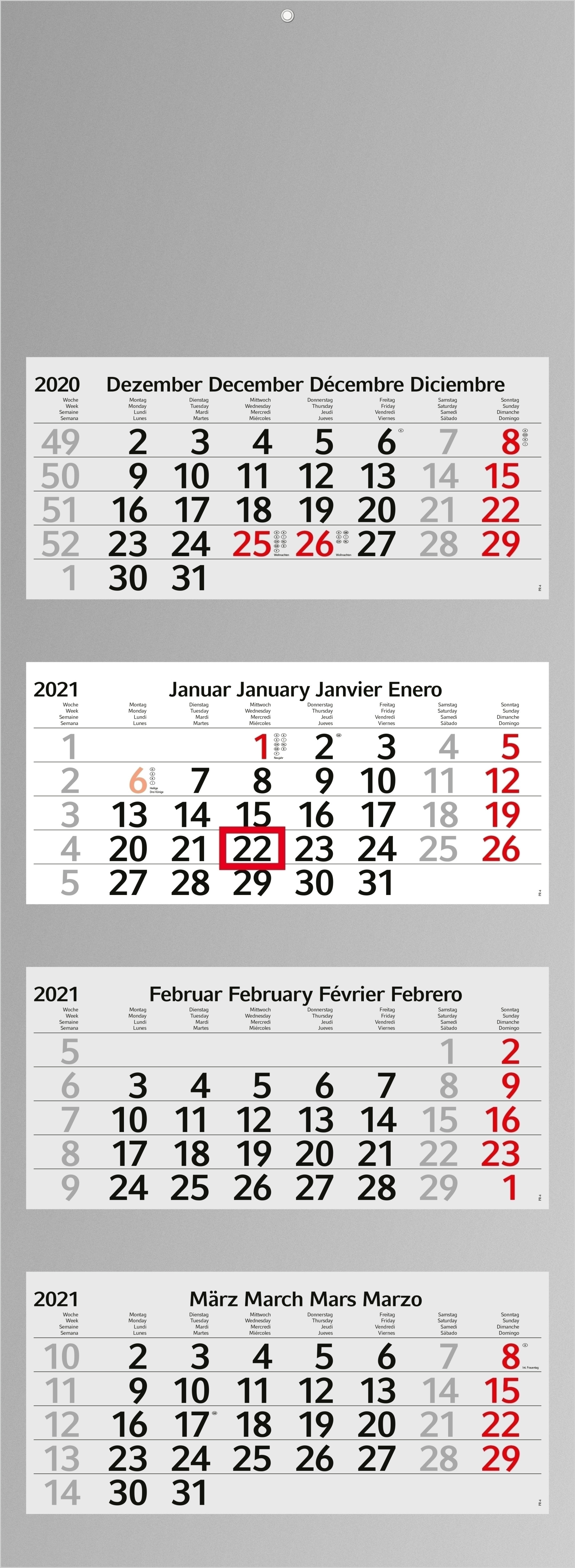 Kalendarium: Deutsch 4sprachig D/GB/F/E - hellgrau. Verarbeitung: Kalenderblocks einzeln perforiert, Rückwand zum drei- oder viermaligen Falten gerillt, Blockhalter-Stanzung, Aufhängeösen aus Metalll. Ausstattung: Datumsschieber rot. Format: 330 x 900 mm gesamt, 300 x 140 mm je Kalenderblock. Druck: 4C-Quality Digital inklusive. Werbefläche: komplette Rückwand. Hinweis: Qualität „Made in Germany“
