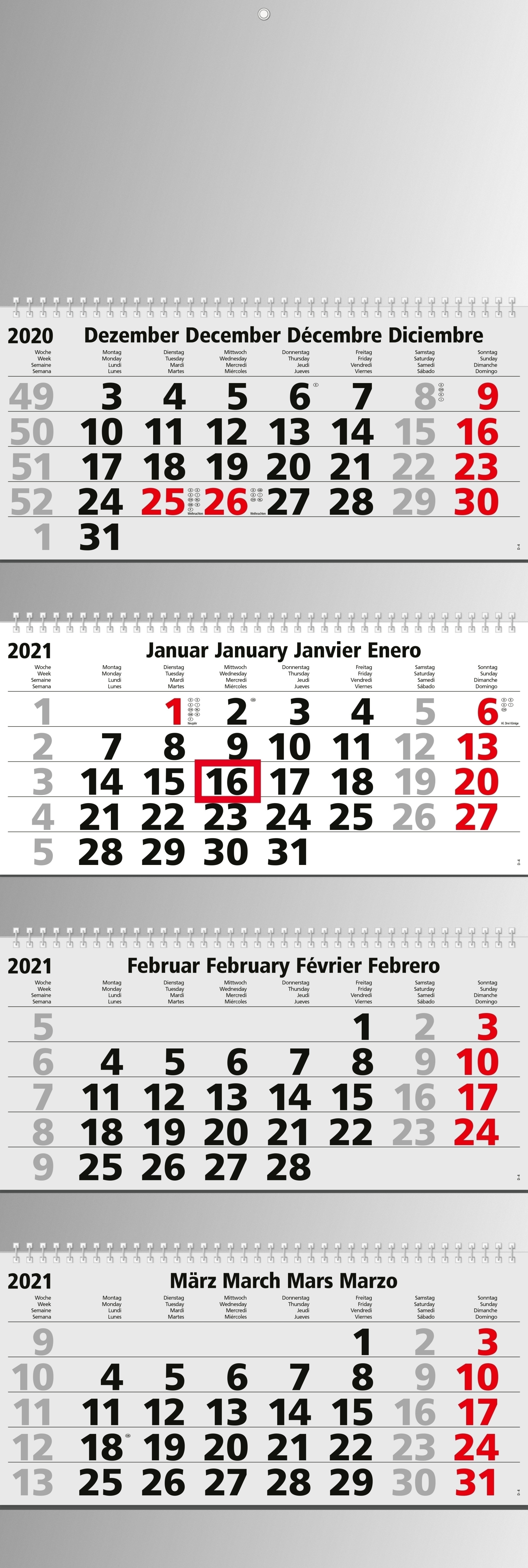 Kalendarium: Deutsch 4sprachig D/GB/F/E - hellgrau. Verarbeitung: Weiße Wire-O-Bindung der Kalenderblocks, Aufhängeöse aus Metalll. Ausstattung: Datumsschieber rot. Format: 335 x 995 mm gesamt, 335 x 160 mm je Kalenderblock. Druck: 4C-Quality Digital inklusive. Werbefläche: 335 x 195 mm am Kopf, 335 x 45 mm auf den Zwischenleisten und auf der Fußleiste. Hinweis: Qualität „Made in Germany“