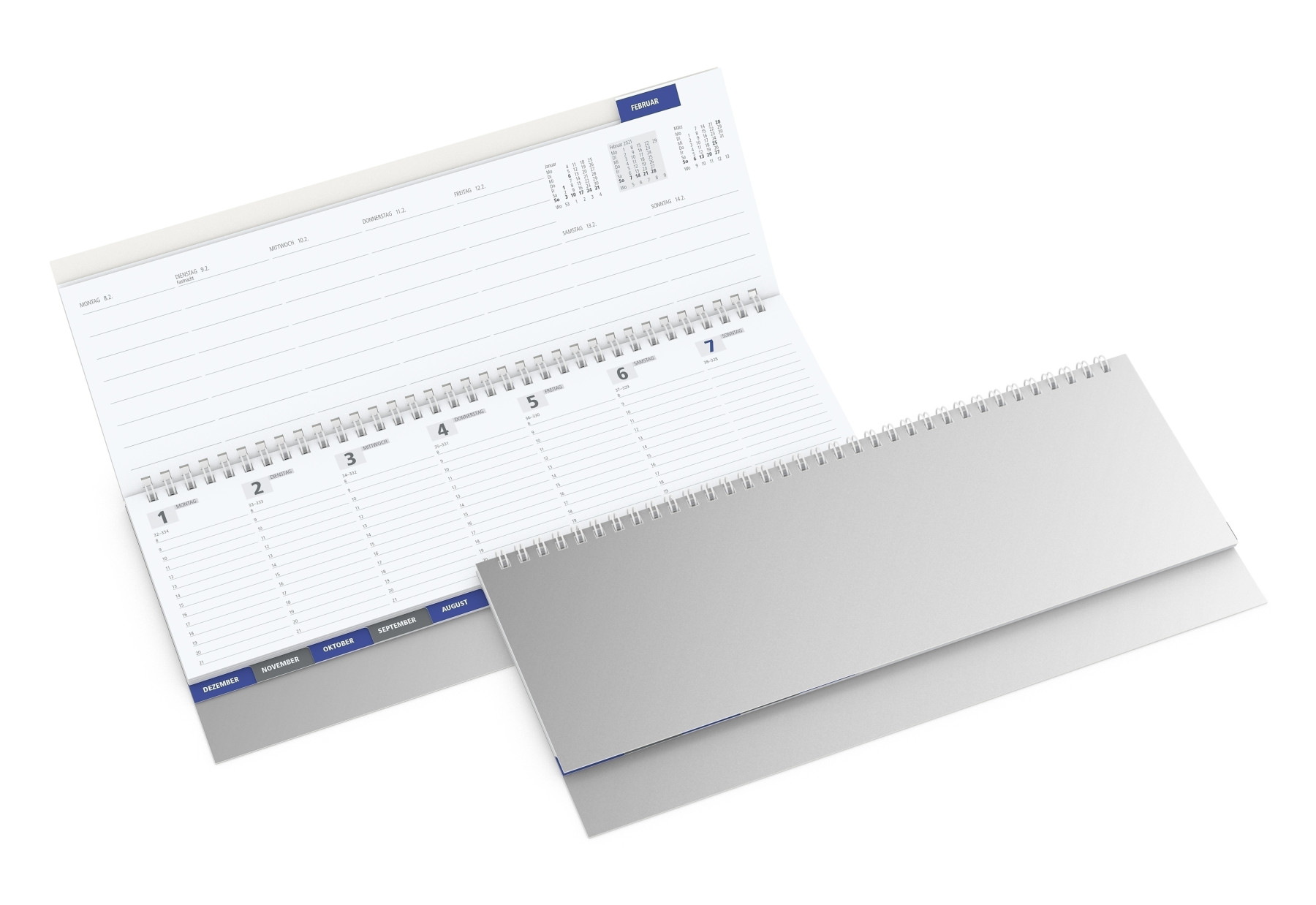 Kalendarium: Deutsch 1sprachig, je Woche 2 Seiten, Stundeneinteilung von 8 bis 21 Uhr auf dem unteren Blatt, Notizraum und 3-Monats-Übersicht auf dem oberen Blatt. Umfang: 128 Seiten. Format: 304 x 105 mm Kalenderblock, 310 x 135 mm gesamt. Verarbeitung: Wire-O-Bindung weiß, Monats-Registerstanzung. Einband: Karton. Werbefläche: Ober- und Unterdeckel (genaue Details siehe Datenblatt). Hinweis: Qualität „Made in Germany“