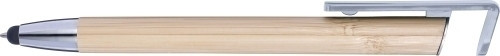 Bambus Kugelschreiber 'Sumatra' mit blauer Mine und Touchpen in einem. Der Schaft ist aus Bambus, der Halter und die Spitze aus Kunststoff. Der Clip dient als Druckknopf und gleichzeitig als Smartphonehalter.