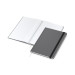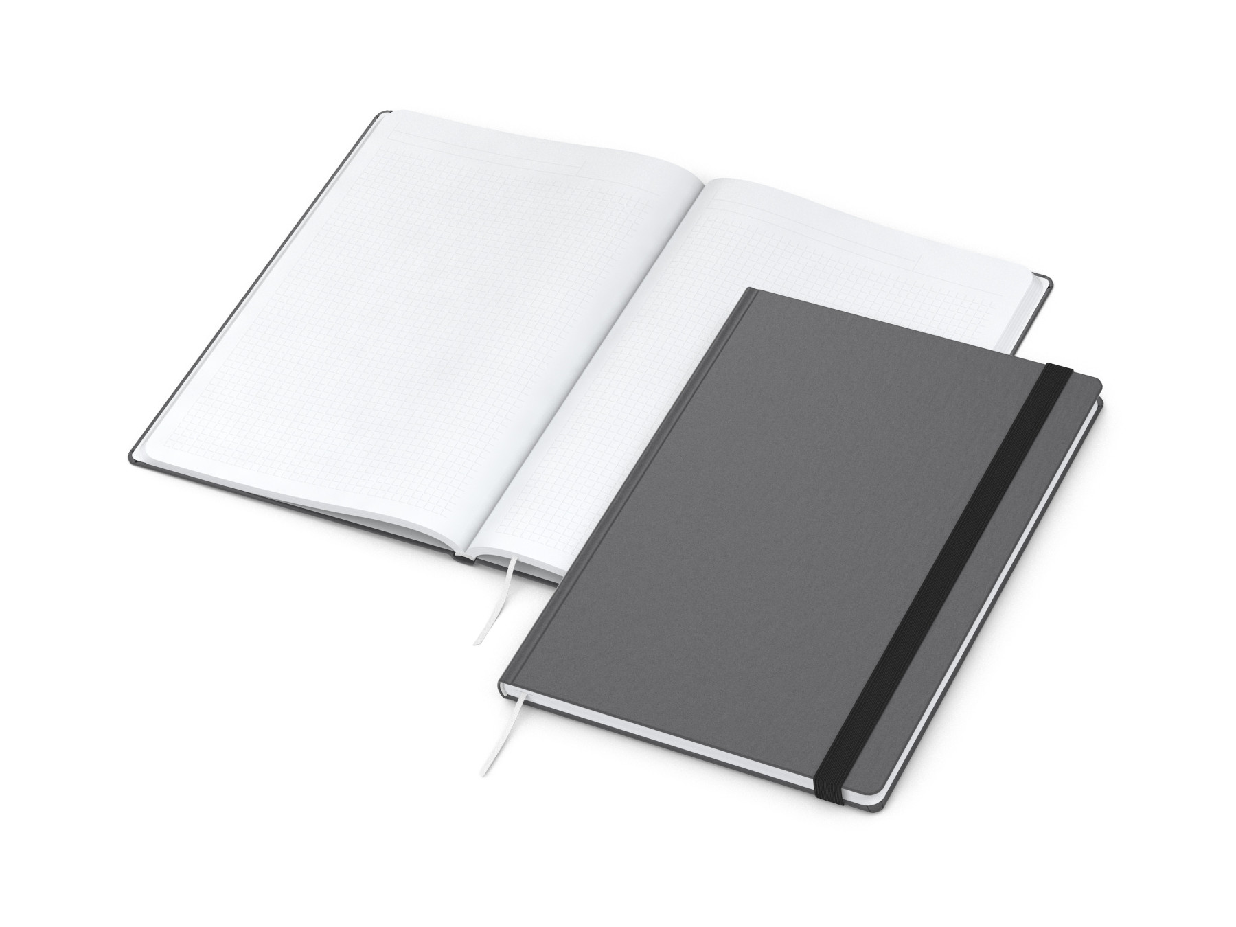 Format: 210 x 297 mm. Verarbeitung: Hardcover mit unwattierter Buchdecke, Buchblock und Decke mit runden Ecken, Lesezeichen, Kapitalband, runder Rücken. Umfang: 192 Seiten plus Einstecktasche. Ausstattung: Notizseiten mit Winkelkaro, Mikroperforation, Einstecktasche, Gummiband schwarz 15 mm. Material: Hochweißes Schreibpapier 90 g/m². Einband: Future anthrazit. Druck: Prägung schwarz-glänzend inklusive. Werbefläche: 100 x 50 mm. Hinweis: Qualität „Made in Germany“