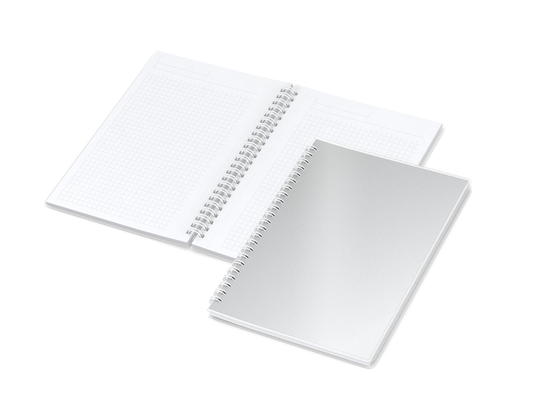 Format: Blattformat inklusive 15 mm; Perforationsrand links; 148 x 210 mm. Verarbeitung: Wire-O-Bindung weiß. Umfang: ca. 80 Blatt. Ausstattung: Notizseiten mit Winkelkaro; Mikroperforation. Material: Hochweißes Schreibpapier 80 g/m². Einband: Polyprop frost-transparent. Druck: 4C-Quality Digital inklusive (Titel). Werbefläche: Werbeblatt hinter dem Einband. Hinweis: Qualität „Made in Germany“