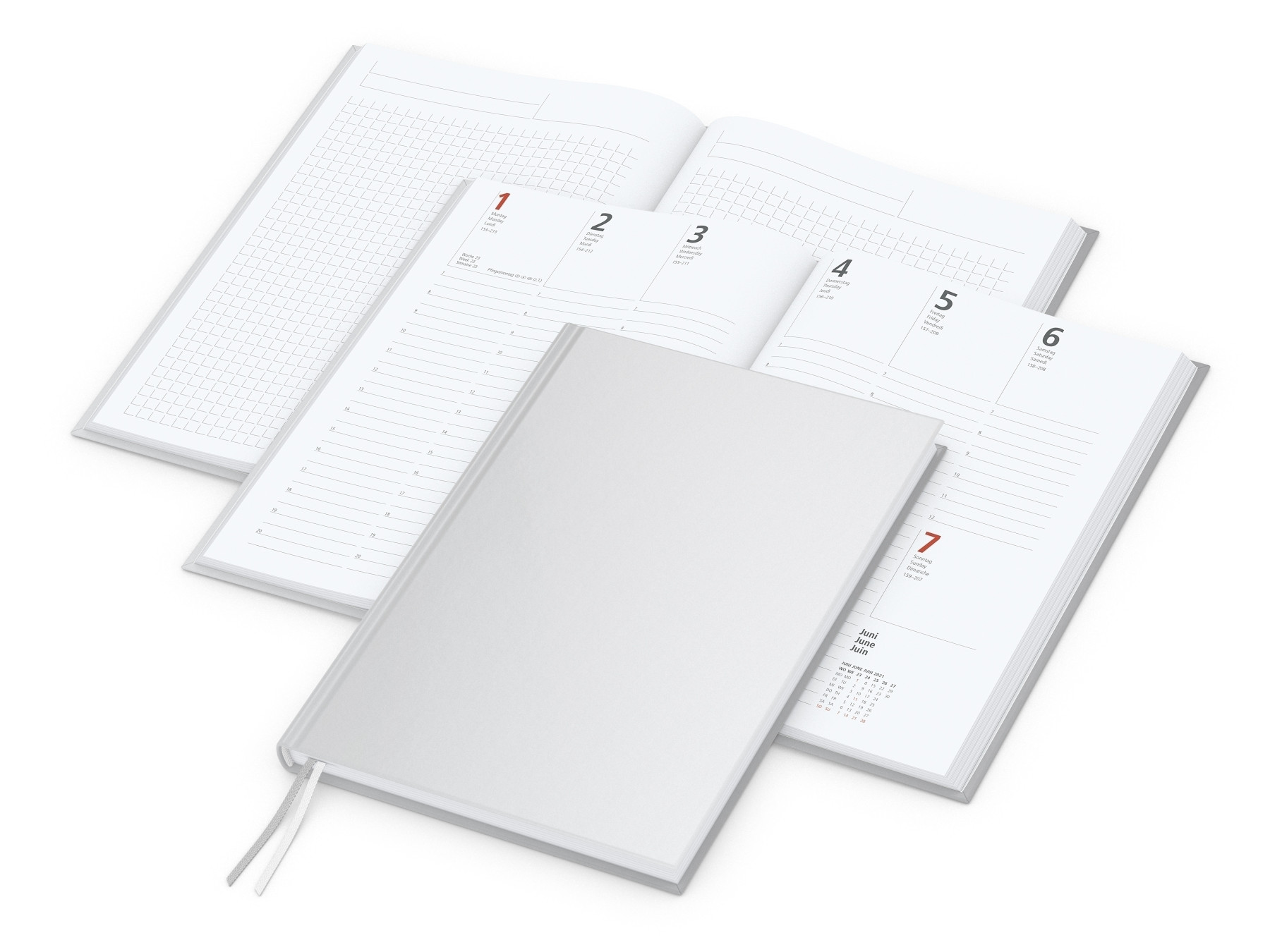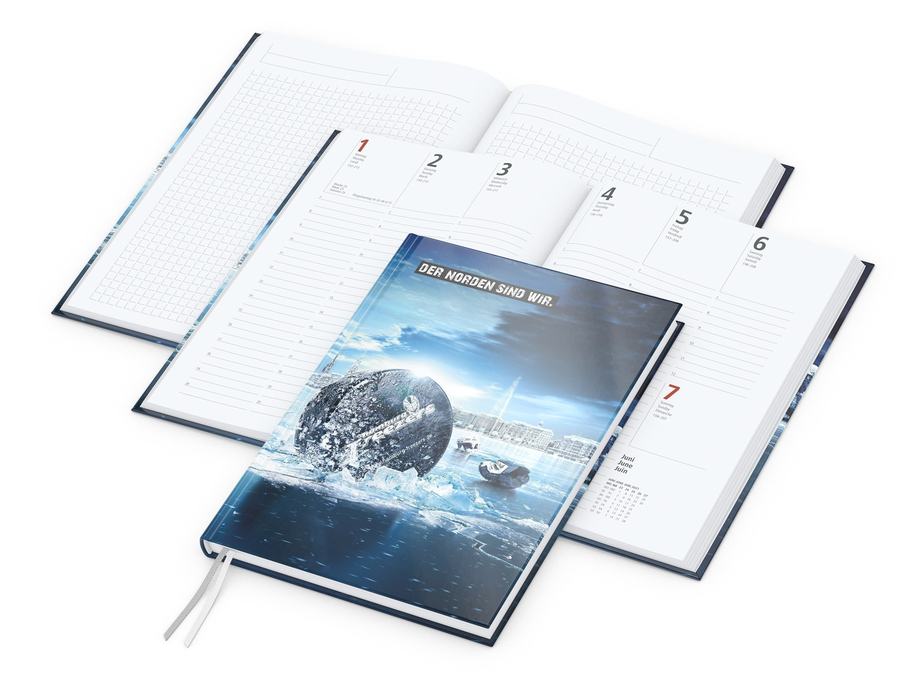 Kalendarium: Wochenkalendarium A5, Deutsch 3sprachig D/GB/F, je Woche 2 Seiten. Umfang: 192 Seiten plus Einstecktasche; 128 Seiten Kalendarium, 64 Seiten Notizen. Format: 148 x 210 mm. Ausstattung: Notizseiten mit Winkelkaro und Mikroperforation, Einstecktasche. Verarbeitung: Hardcover mit unwattierter Buchdecke, Eckenperforation, 2 Lesezeichen, Kapitalband, runder Rücken. Material: hochweißes Schreibpapier 90 g/m². Einband: Cover-Star gloss-individuell (auf Wunsch matt-individuell, ohne Mehrpreis). Werbefläche: Kompletter Einband. Druck: 4C-Quality Digital inklusive. Hinweis: Qualität „Made in Germany“